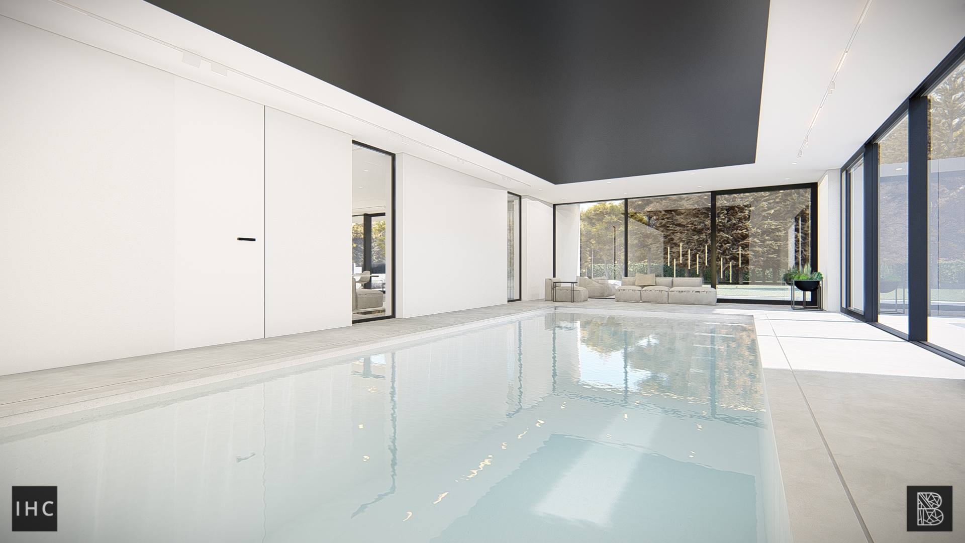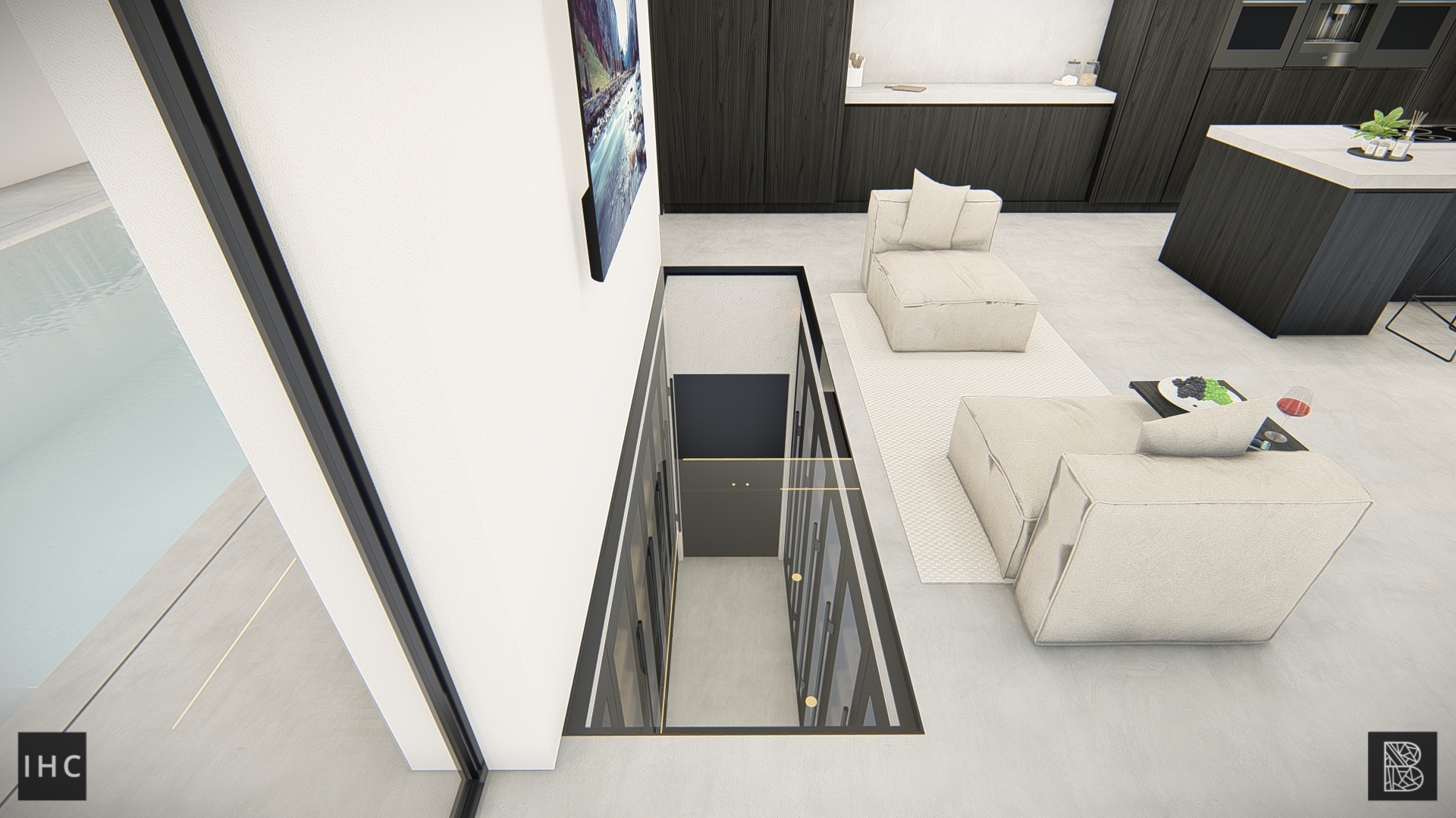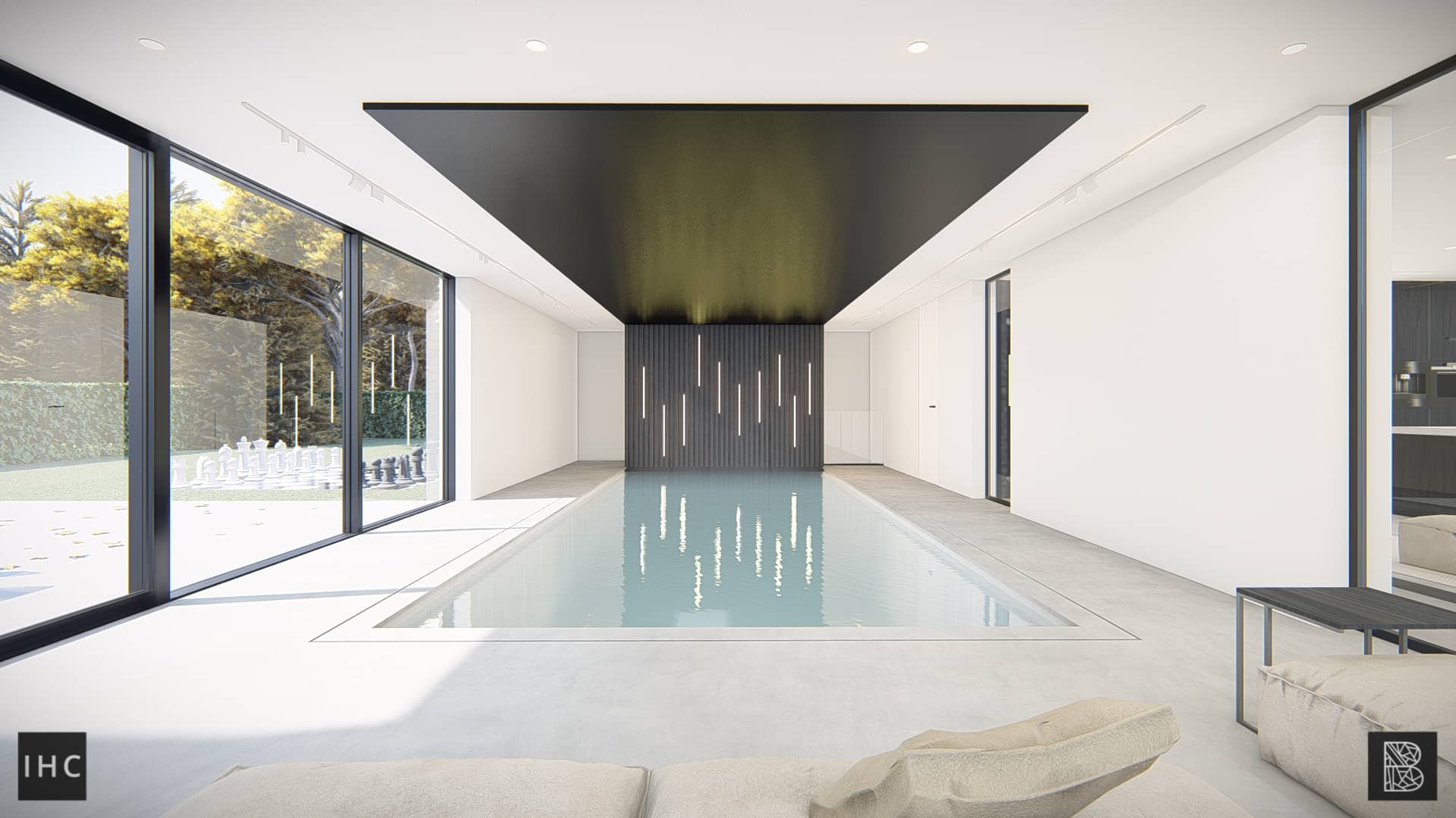 Behind the pool, the loft and stairs connect the room with the wellness basement.