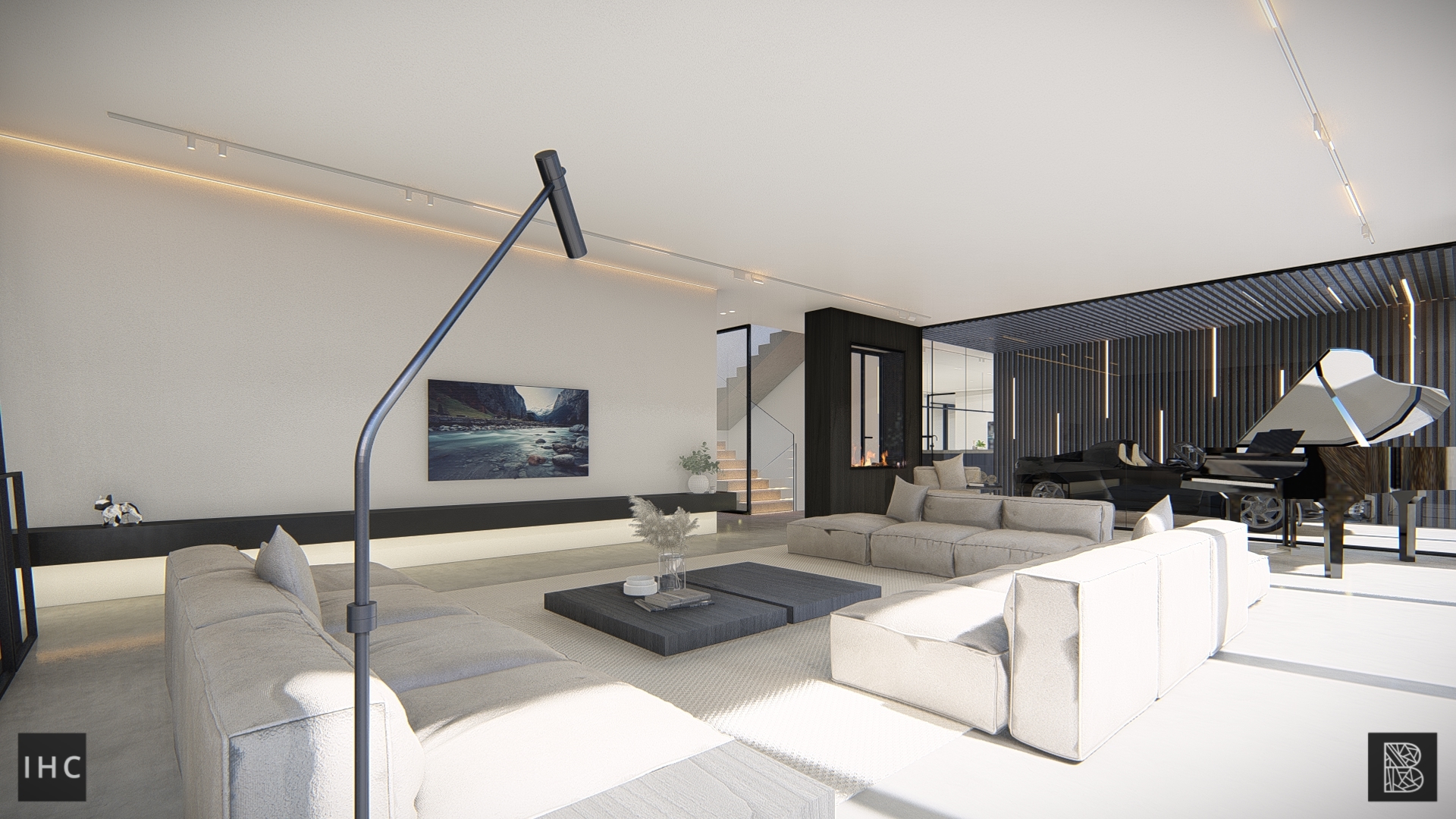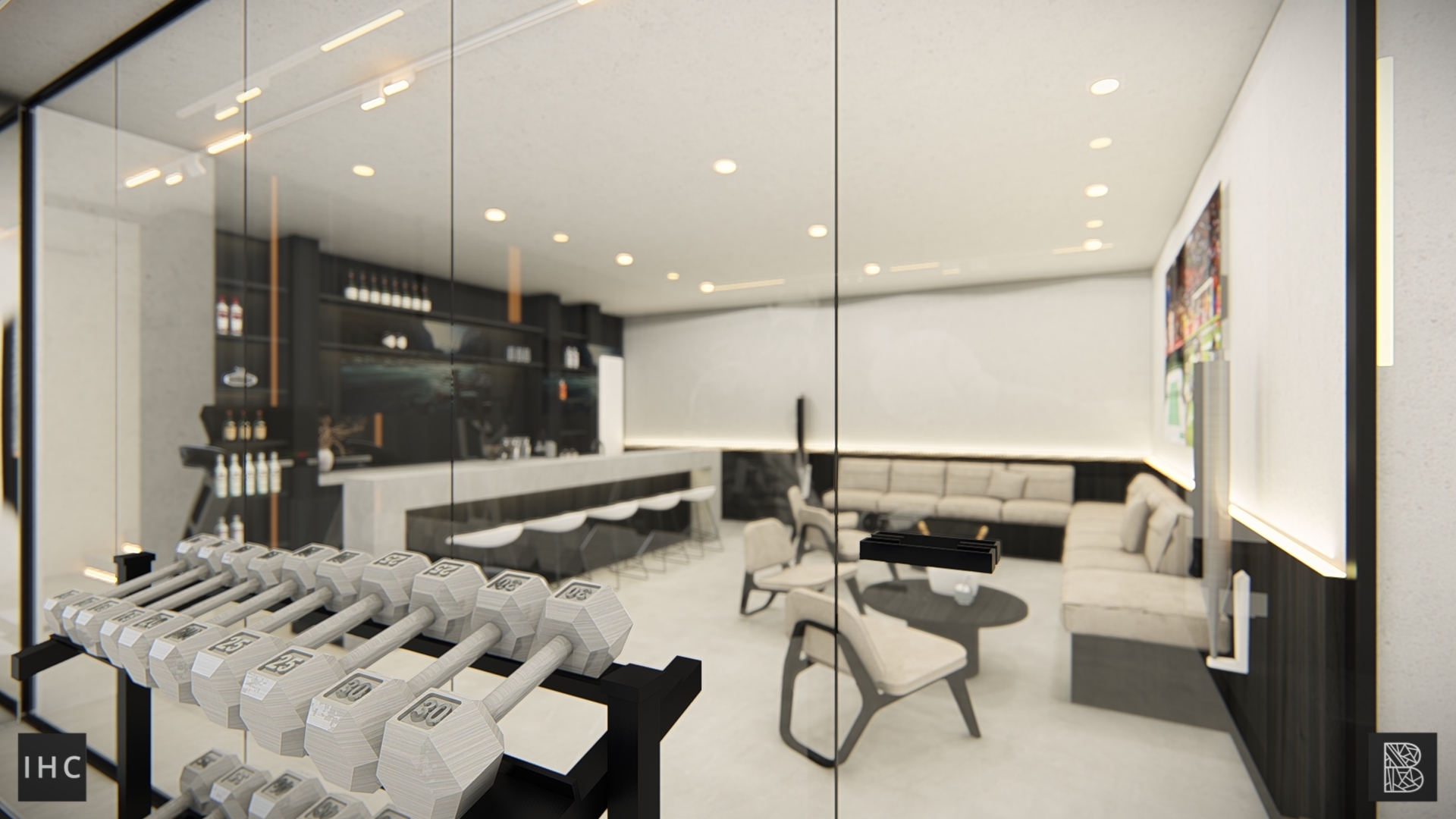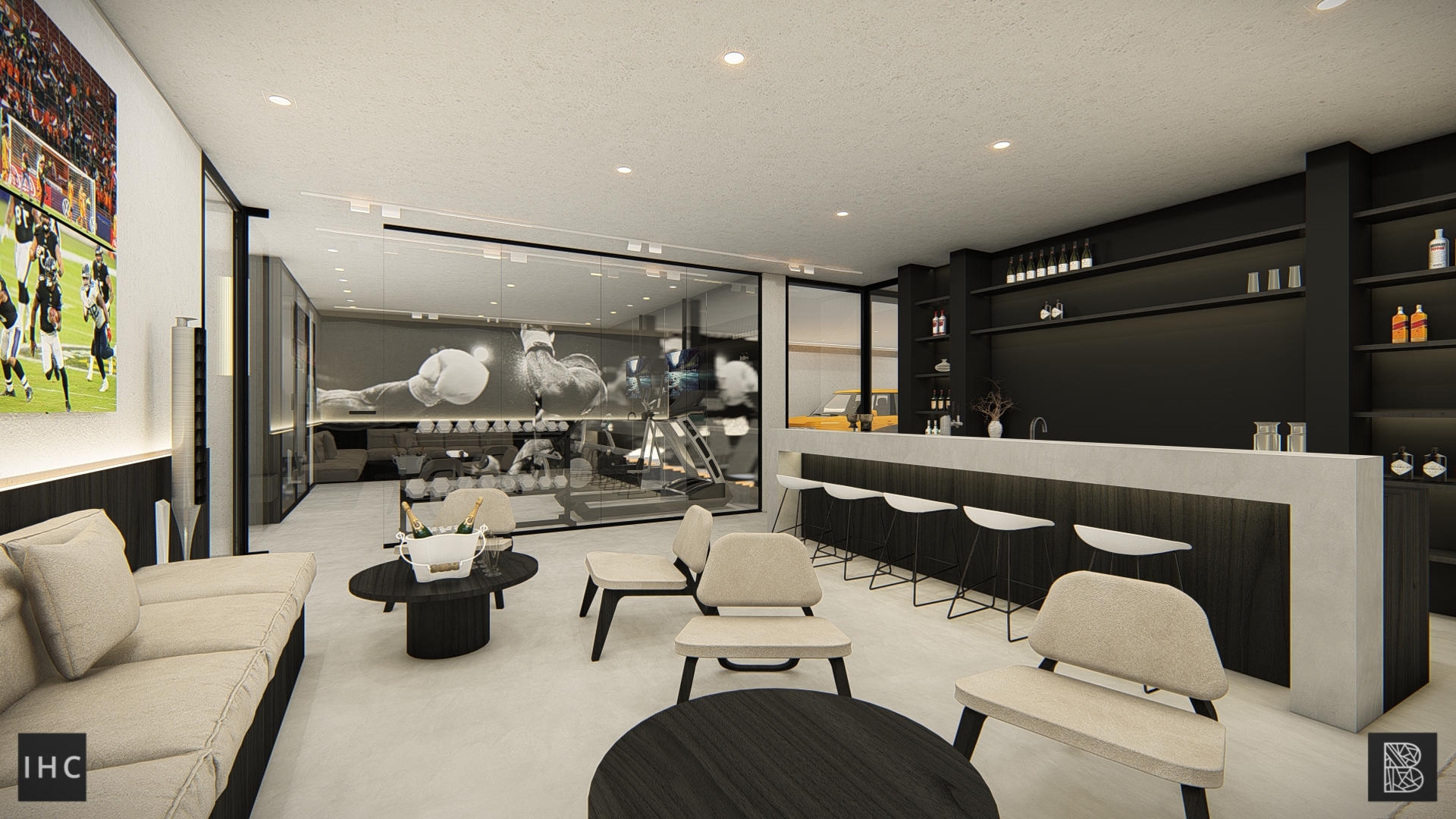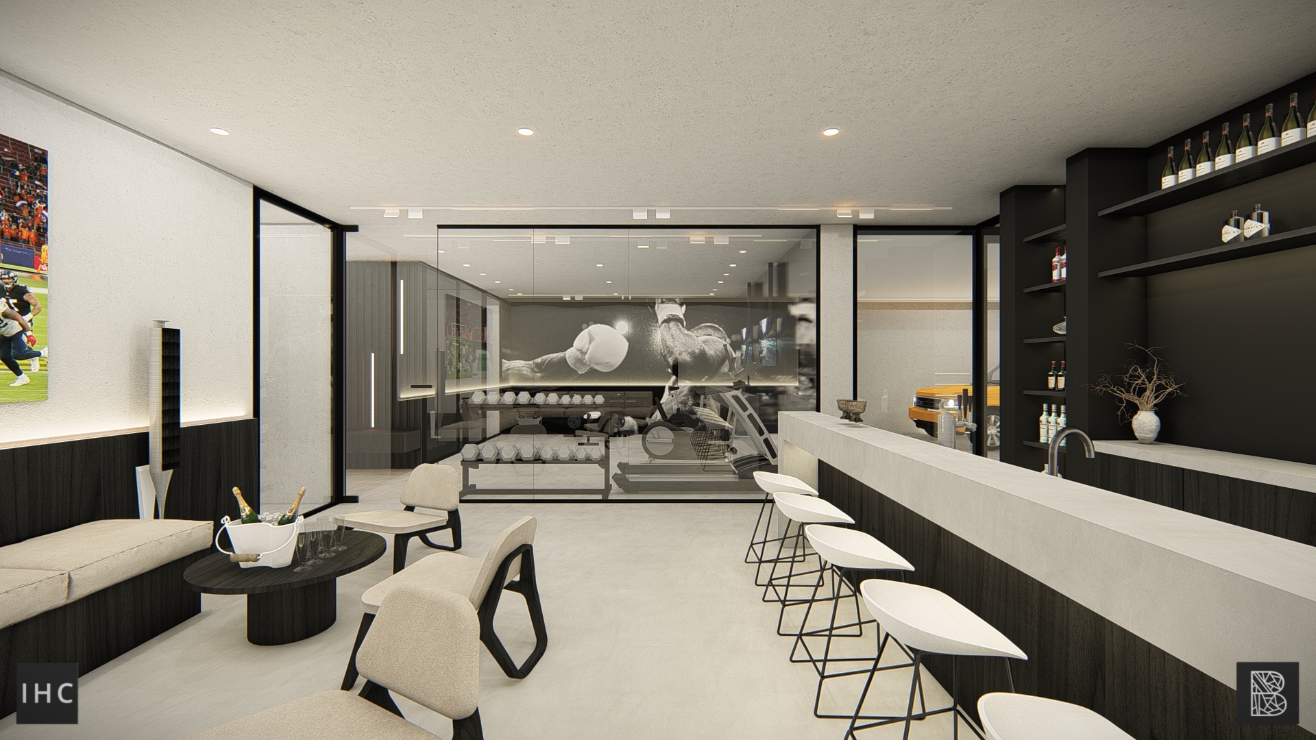 Behind the pool, the loft and stairs connect the room with the wellness basement.