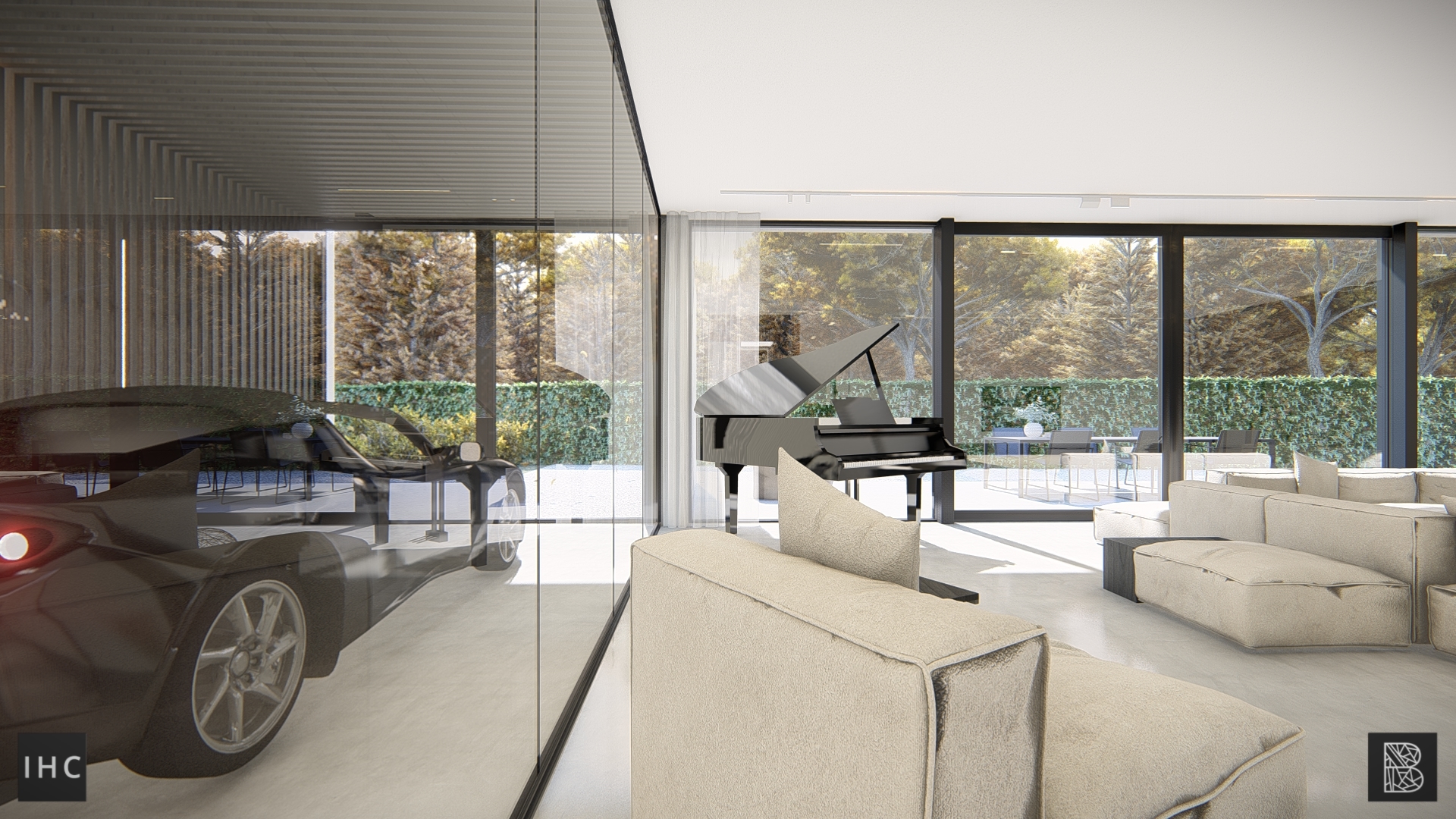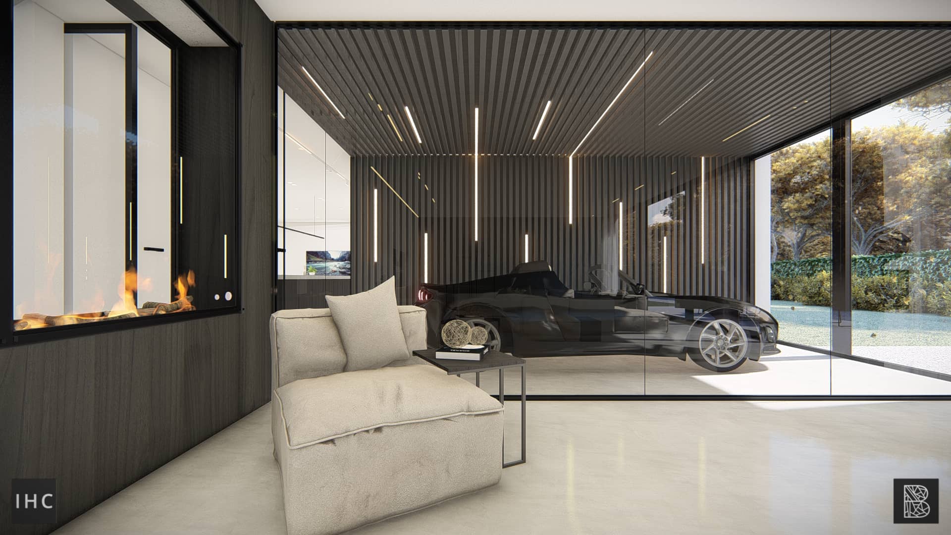 The client’s favourite car is the centre of attention in the house. Not only figuratively but also literally in the space. Through a glass box with a pronounced interior and lighting plan, the car forms a room divider between the living room, kitchen and master bedroom.