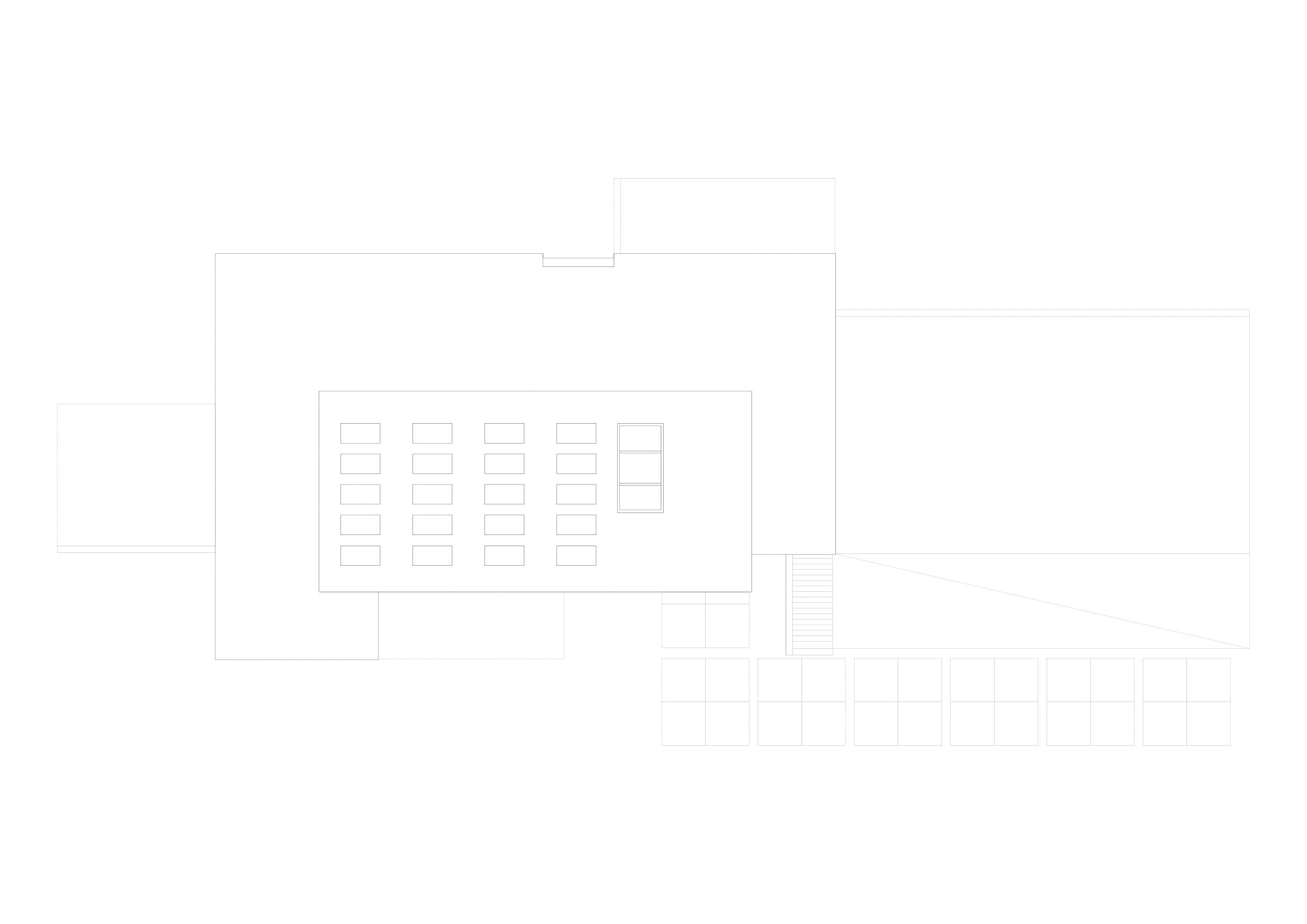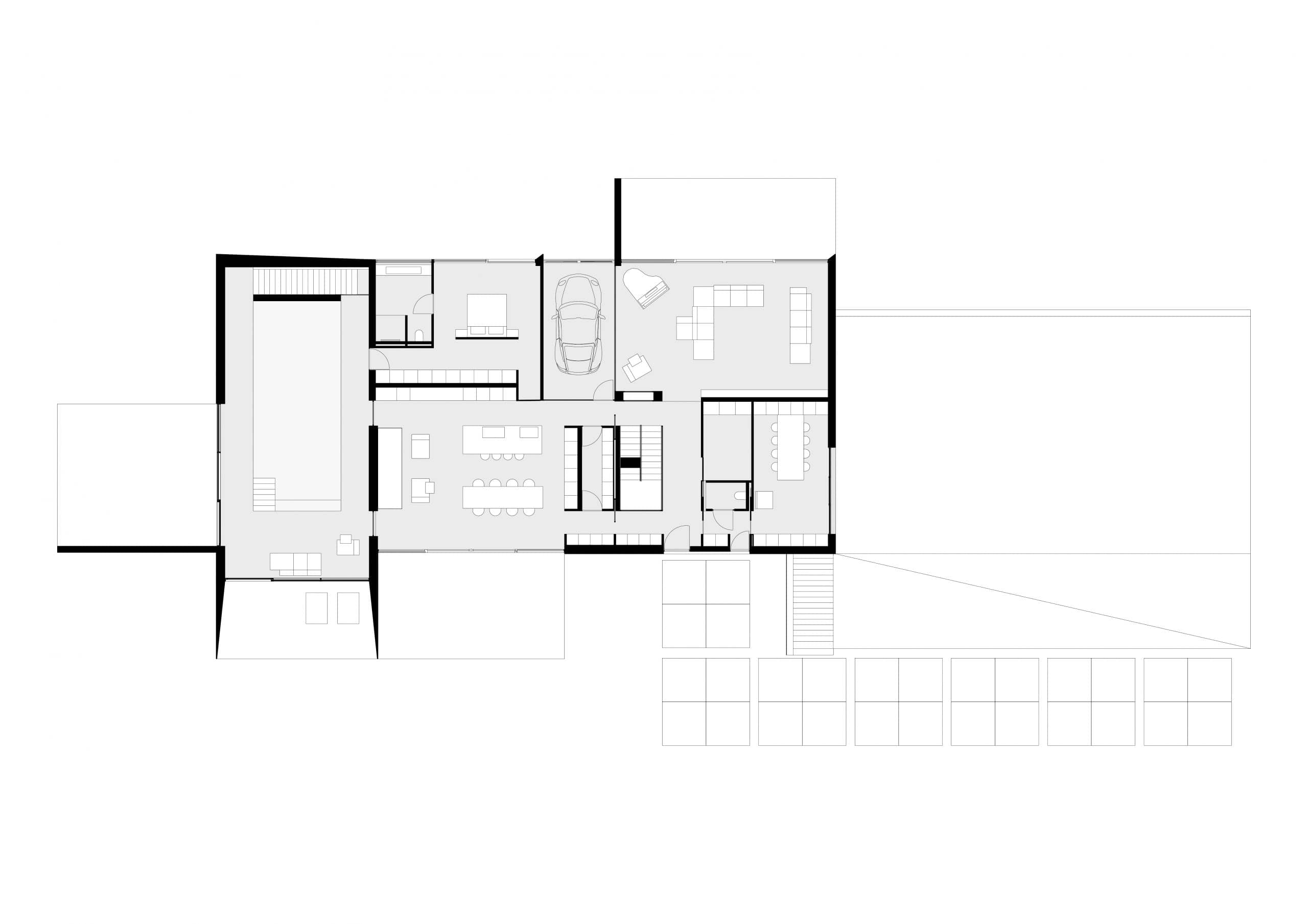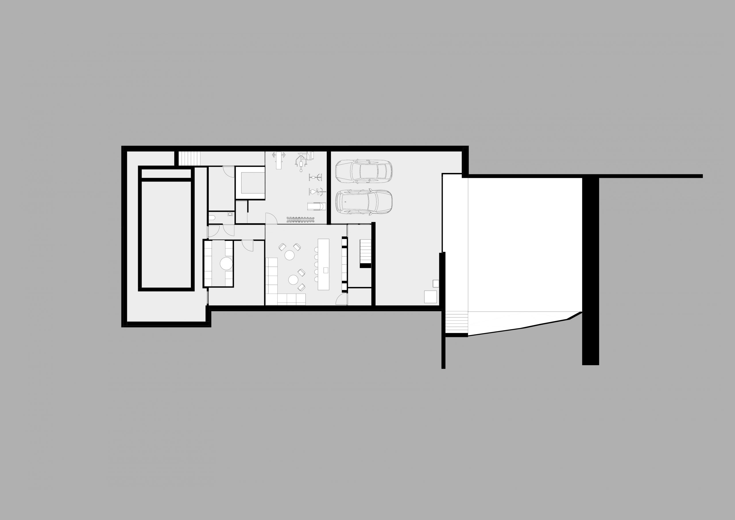 De begane grond zweeft als een betonnen doos over het maaiveld waarbij het binnen zwembad optisch is losgekoppeld middels een frame wat fungeert als overdekt terras met minimal aflopende schuintes. Vanuit de 9 meter brede inrit kan letterlijk onder de woning door gereden worden het souterrain te bereiken. Dit overstek wordt versterkt door de futuristische lichtlijnen.