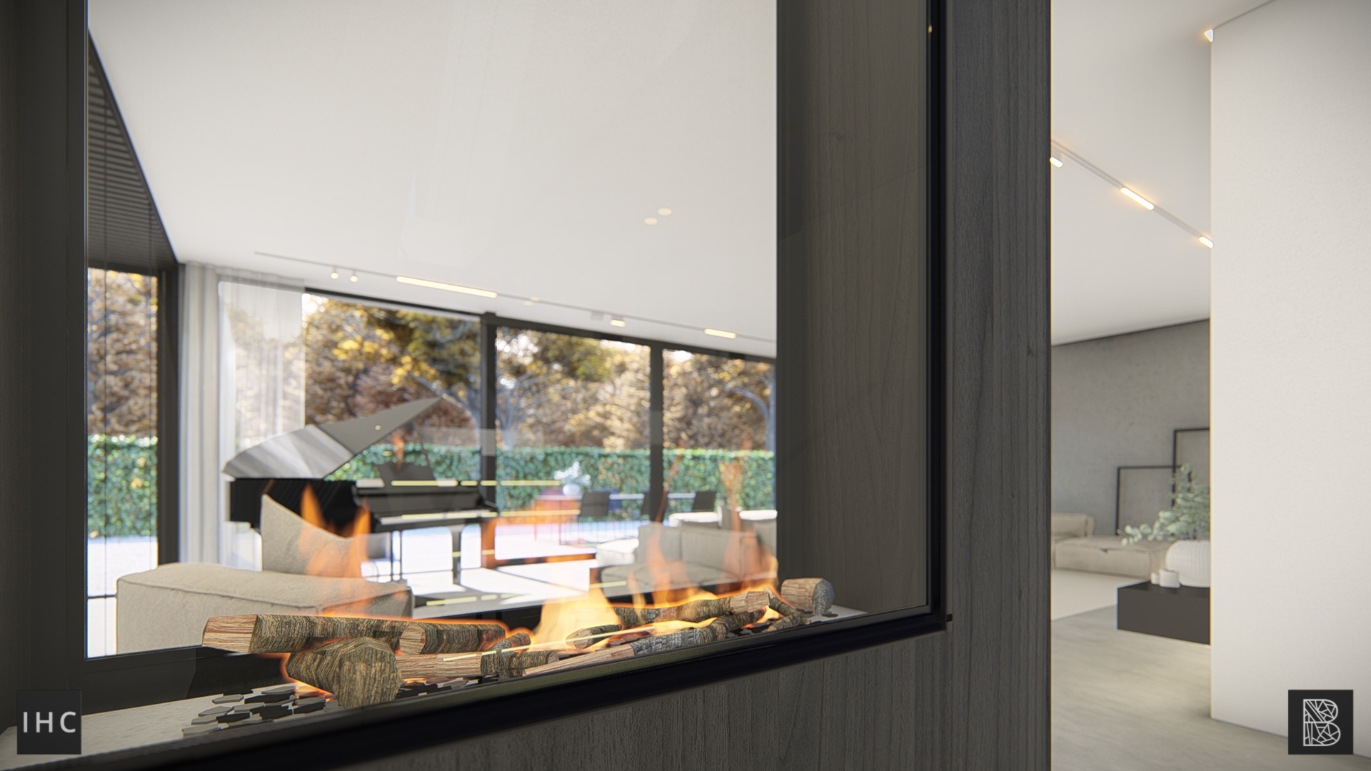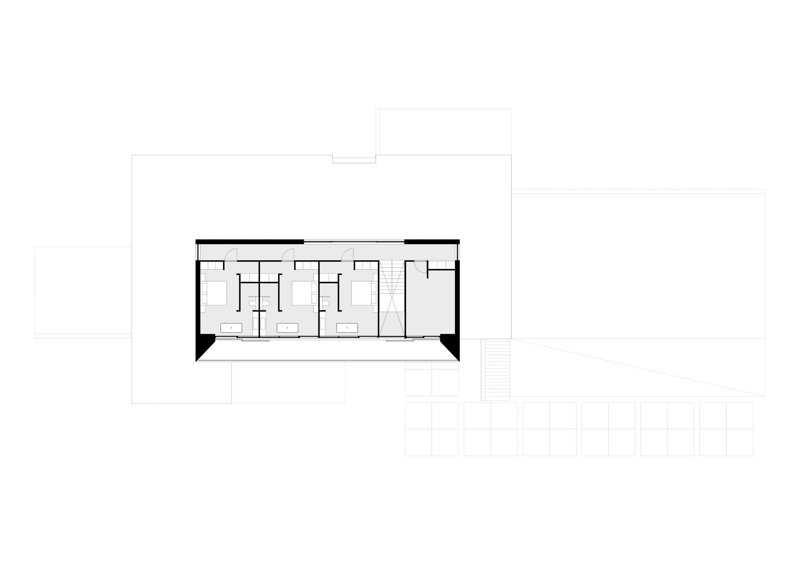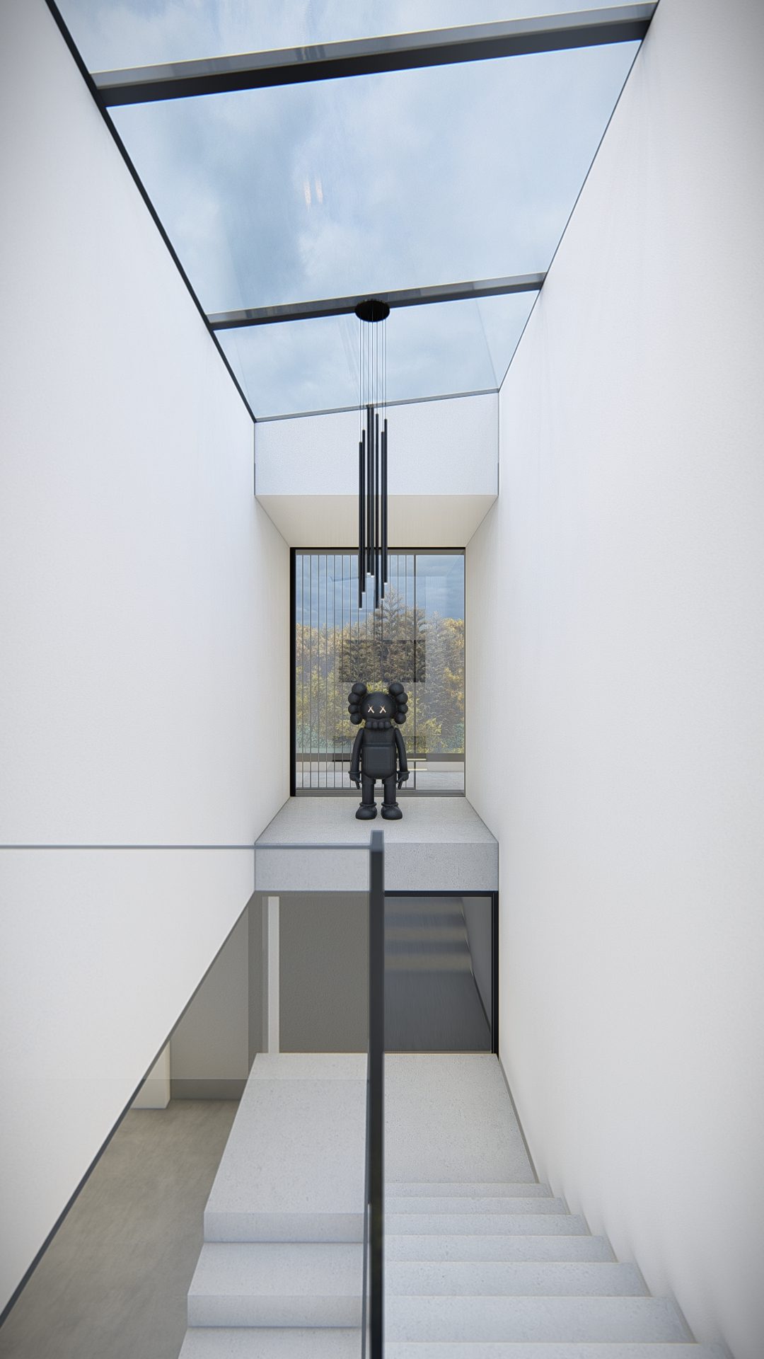 De begane grond zweeft als een betonnen doos over het maaiveld waarbij het binnen zwembad optisch is losgekoppeld middels een frame wat fungeert als overdekt terras met minimal aflopende schuintes. Vanuit de 9 meter brede inrit kan letterlijk onder de woning door gereden worden het souterrain te bereiken. Dit overstek wordt versterkt door de futuristische lichtlijnen.