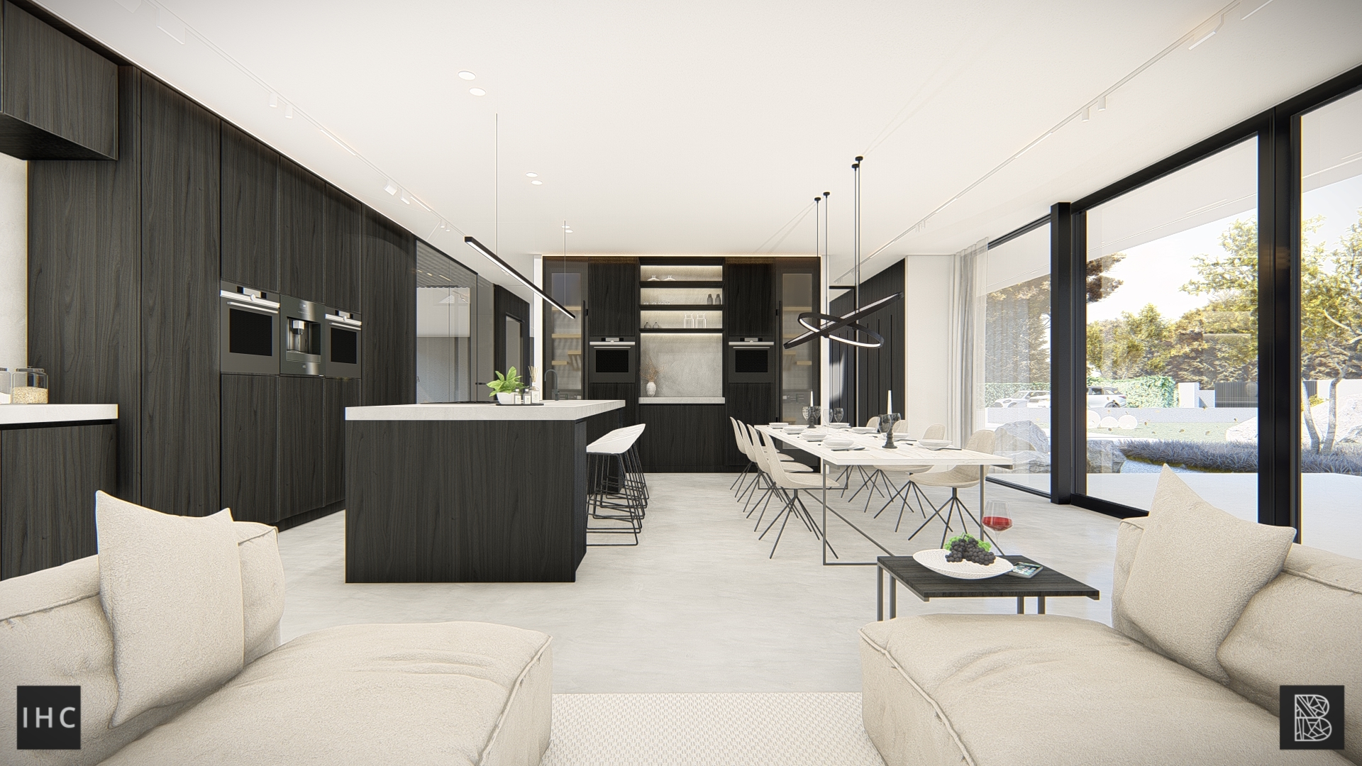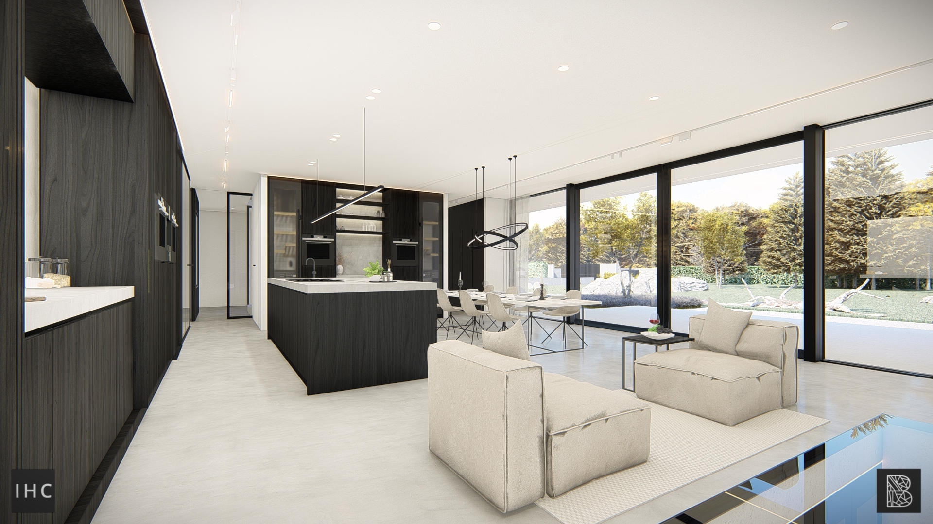 Where black aluminum window frames provide a contrast to the white stucco but at the same time are subtly incorporated into the structural elements.