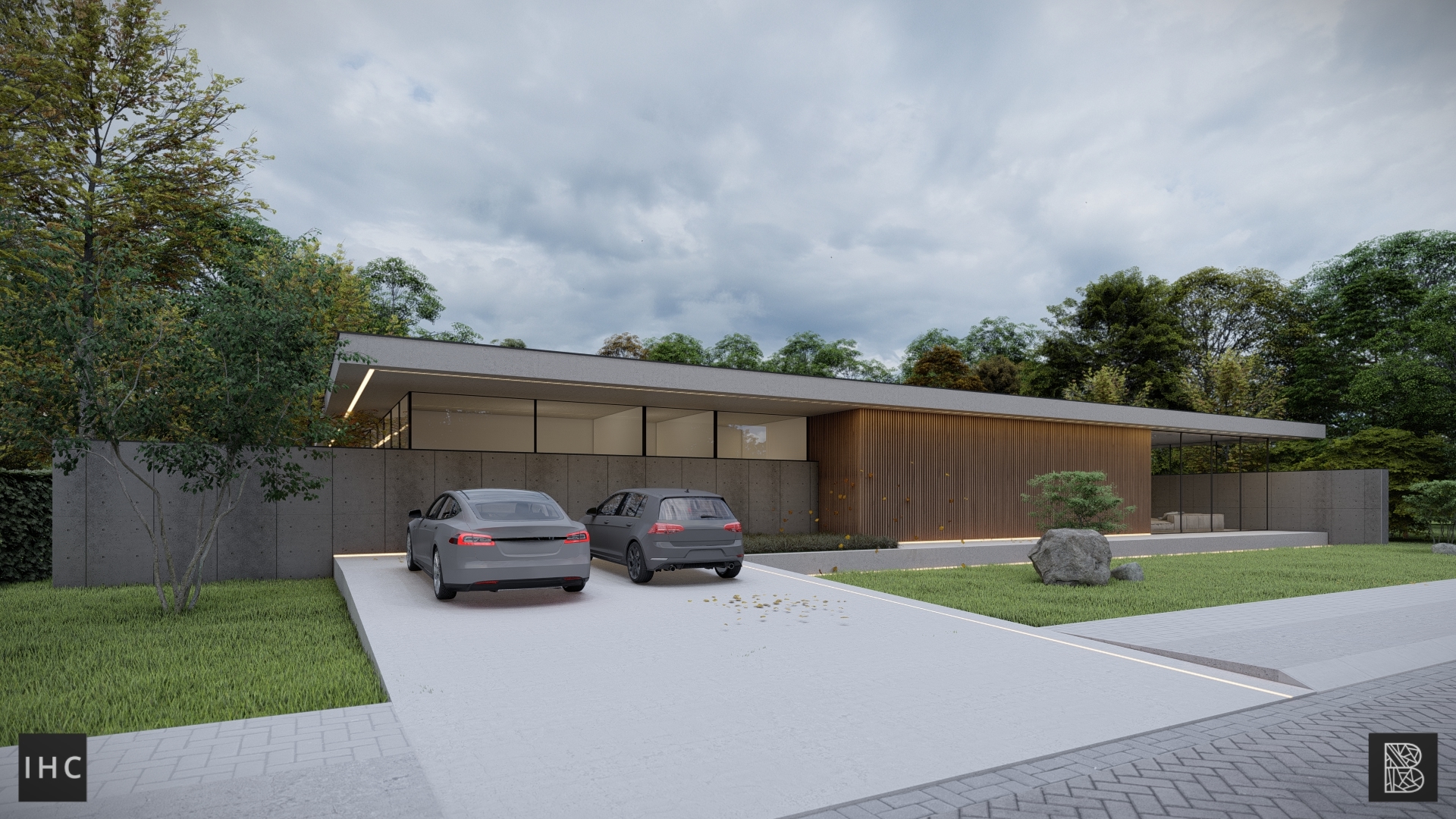 Another challenge are the regulation of the plot. The maximum building height is 4 meters, so a tall, two-story building is not permitted. By stacking two L-shapes and lowering one into the ground, the building appears to be a modest bungalow from the street. But by implementing a large central patio, a bold, two-story building is created, which opens up completely to the garden.