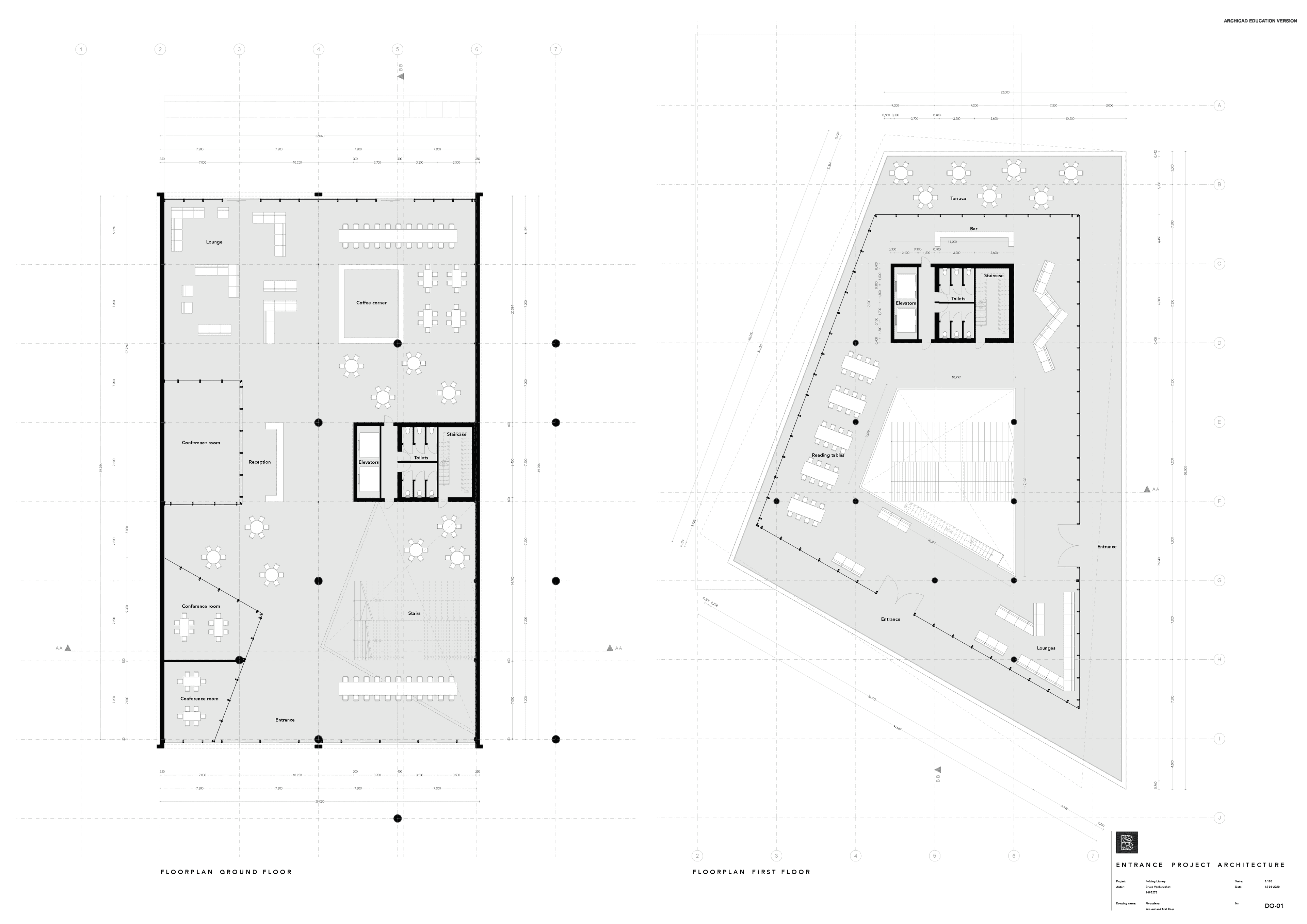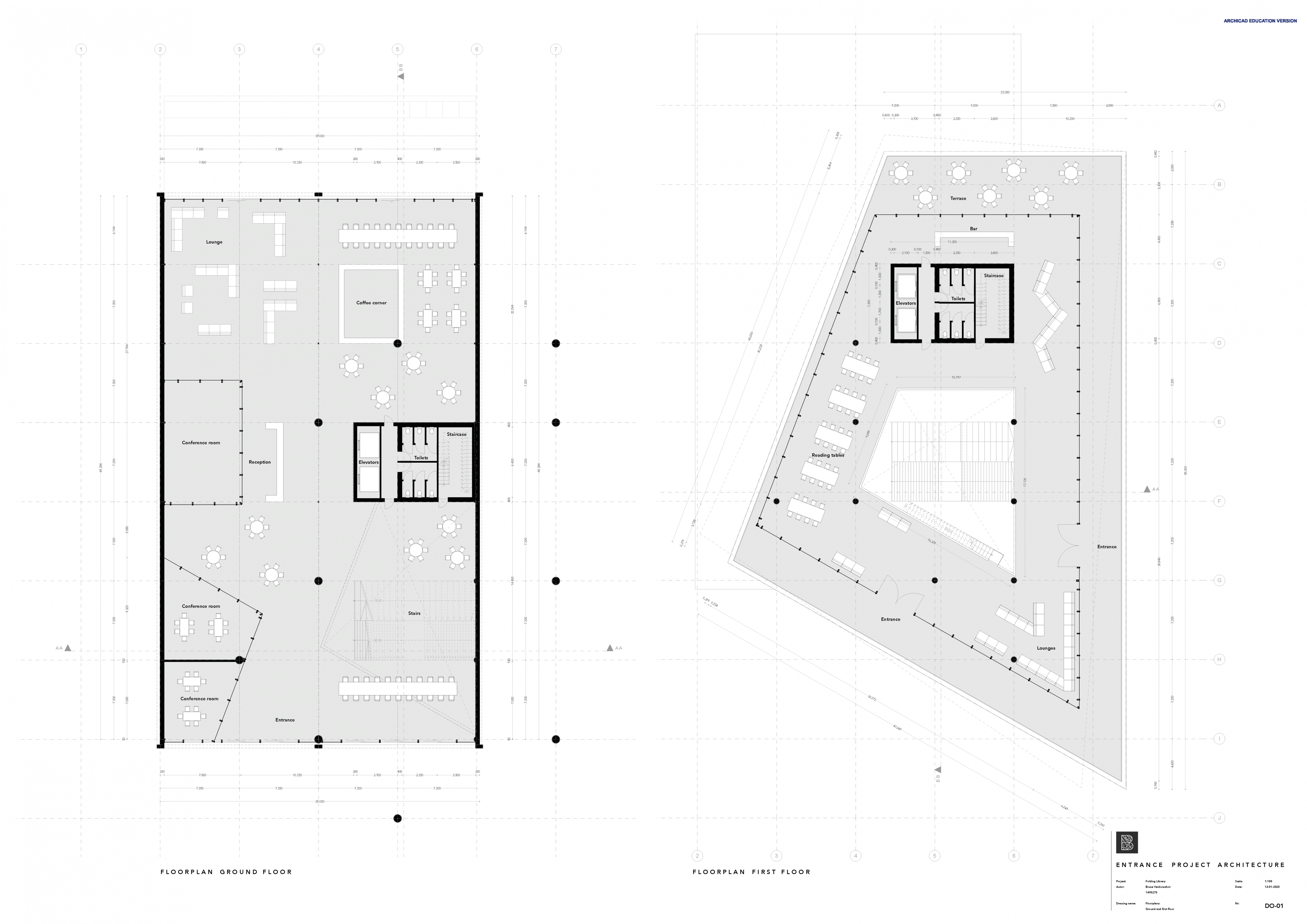 “Folding library is the new study heart of Eindhoven. The contrast between the old and the new is embraced by the cantilivering, folding floors over de old brick facade. The new building folds like a book over the existing garages. ”