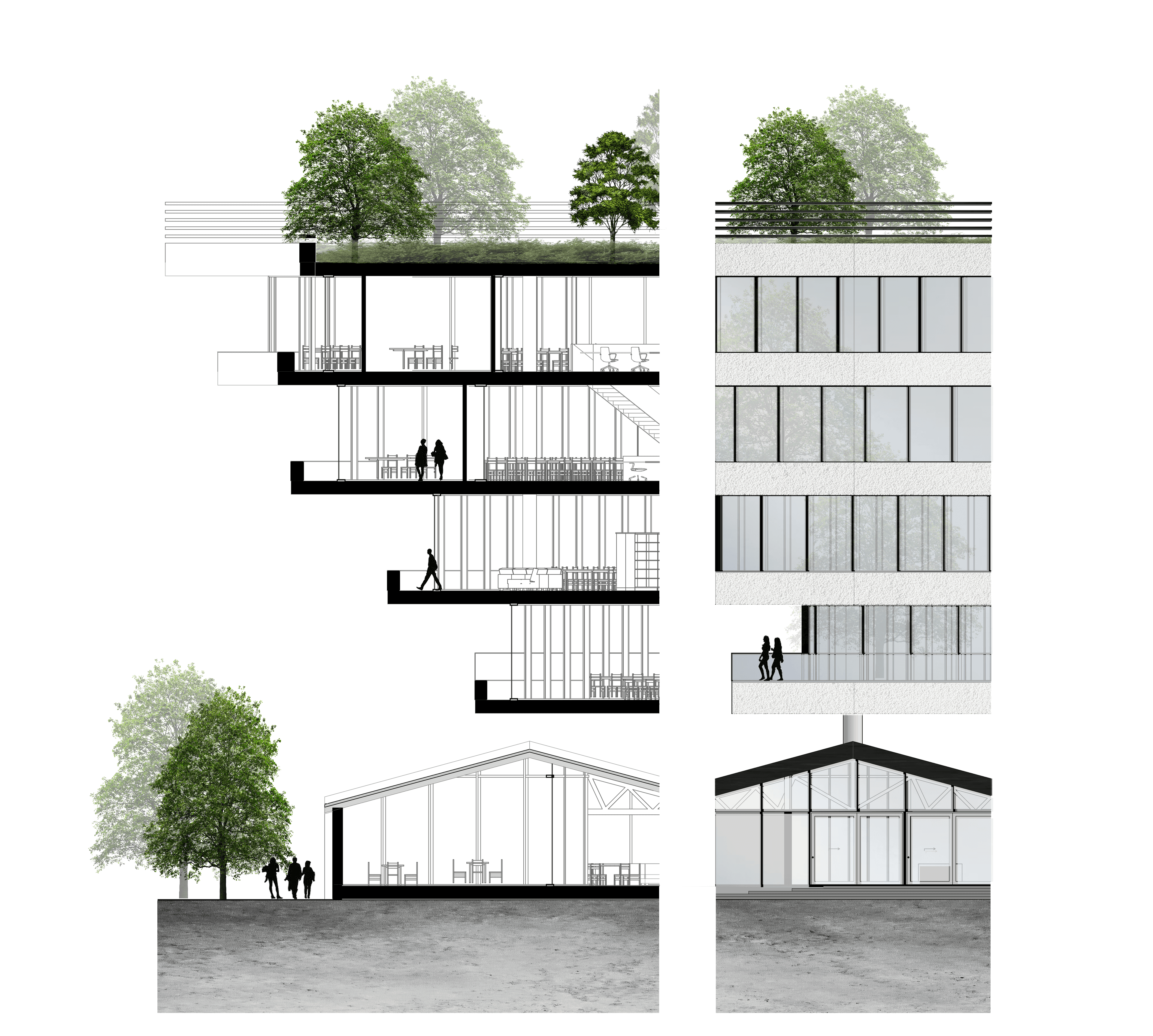 The concept is based on connection. By lifting the new volume it provides multiple routes at ground level and connections to surrounding buildings through the roof gardens. The old building is connected with new building throughout a glass surroundig wich follows the outlines of the void. This creates a transparant connection where people litterly can walk from one building to another.