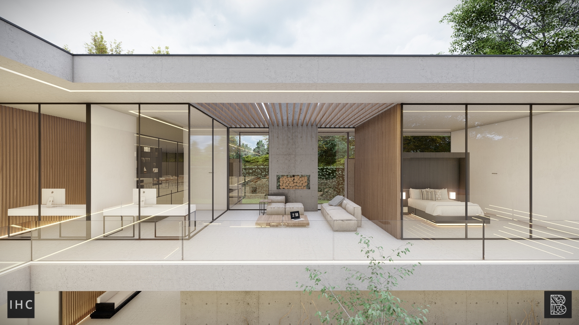 The unique architecture is emphasized by its raw materialization. Concrete in its purest form is allowed to shine as a steady base, creating serenity through simplicity and repetition throughout the building. This is contrasted by the natural aesthetic wood has, creating balance while continuing the vertical repetition. The floors and roof have a smooth concrete finish to keep the material usage simple and not overshadow the expressive architecture. With thin window frames, views are minimally obstructed and plenty of natural daylight can enter. Finally, the building is lit with LED lines, highlighting important architectural choices and illuminating the architecture evenly.