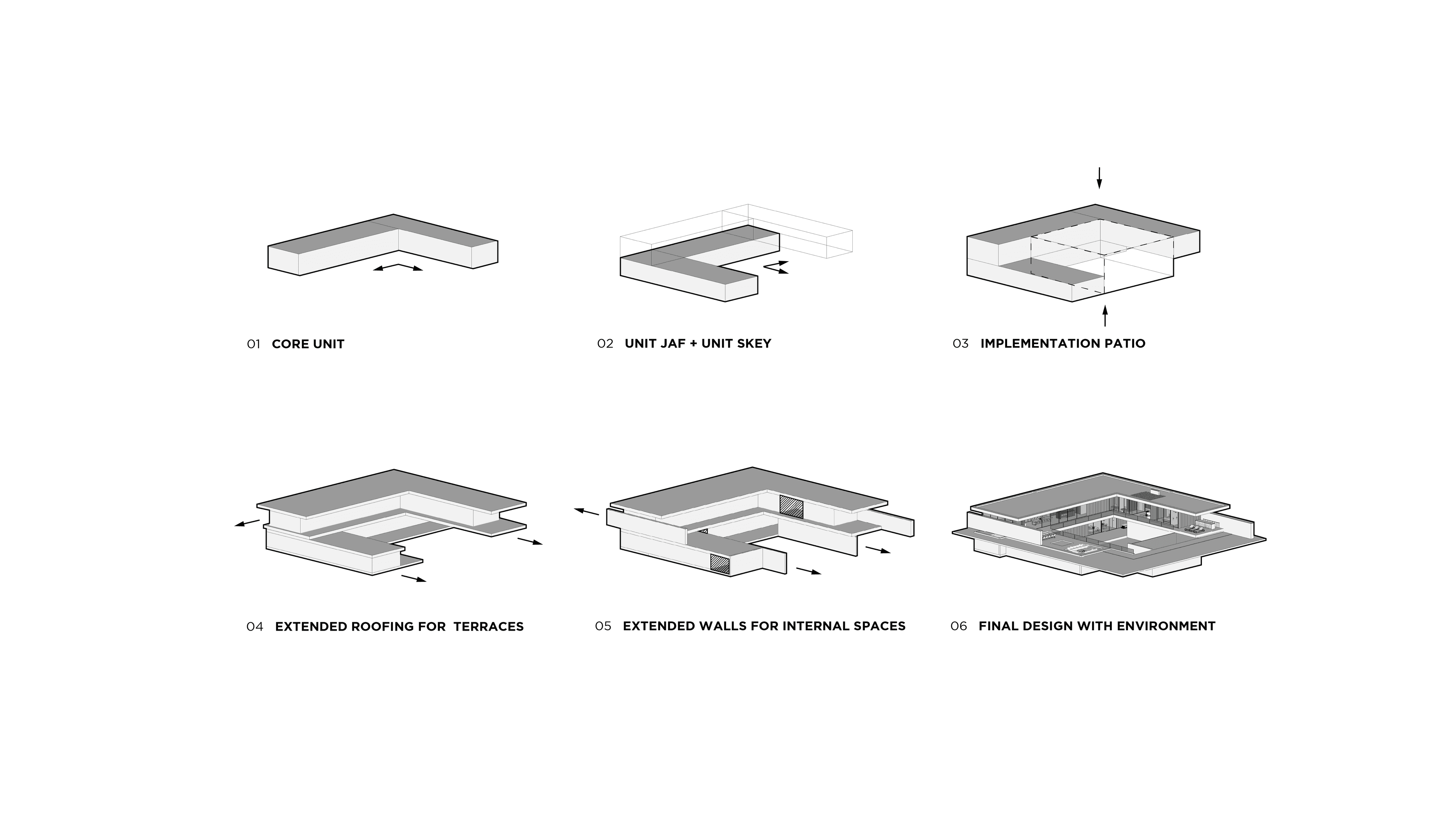 The starting point of the concept are two L-shapes stacked on top of each other on one axis. These two L-shapes embrace the central patio and each other, connecting the two families visually and physically. Privacy is kept by extending walls to create internal spaces.