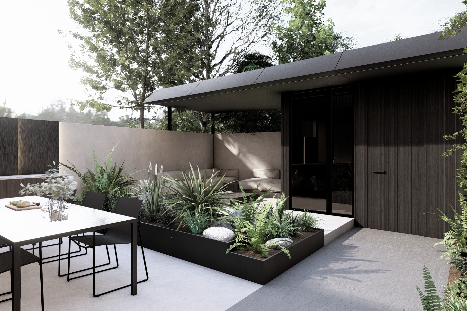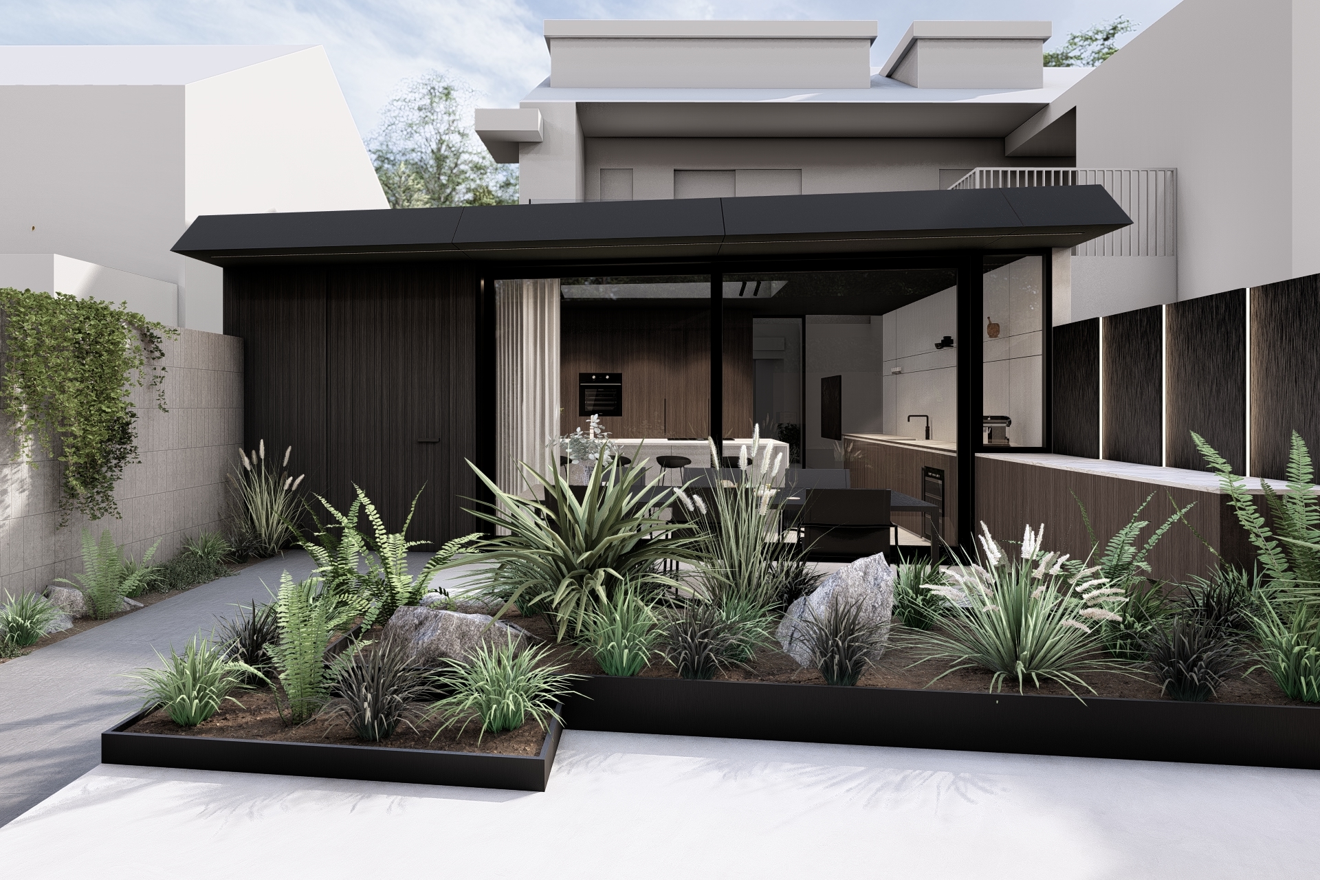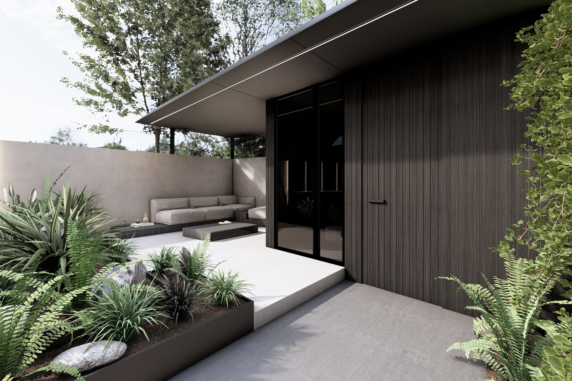 Further into the garden, a covered wellness volume with sauna and storage is finished in the same charred timber, strengthening the unity of the ensemble. Height differences, concrete accents, a continuous stone path and a natural stone green wall bring playfulness and softness to the landscape. The result is a compact extension with a powerful spatial impact.