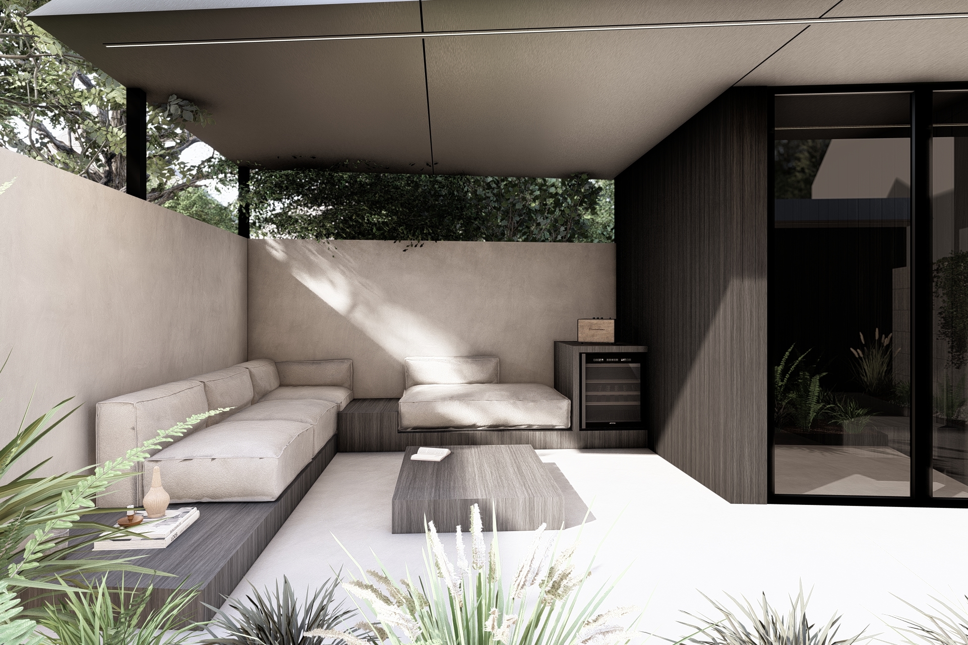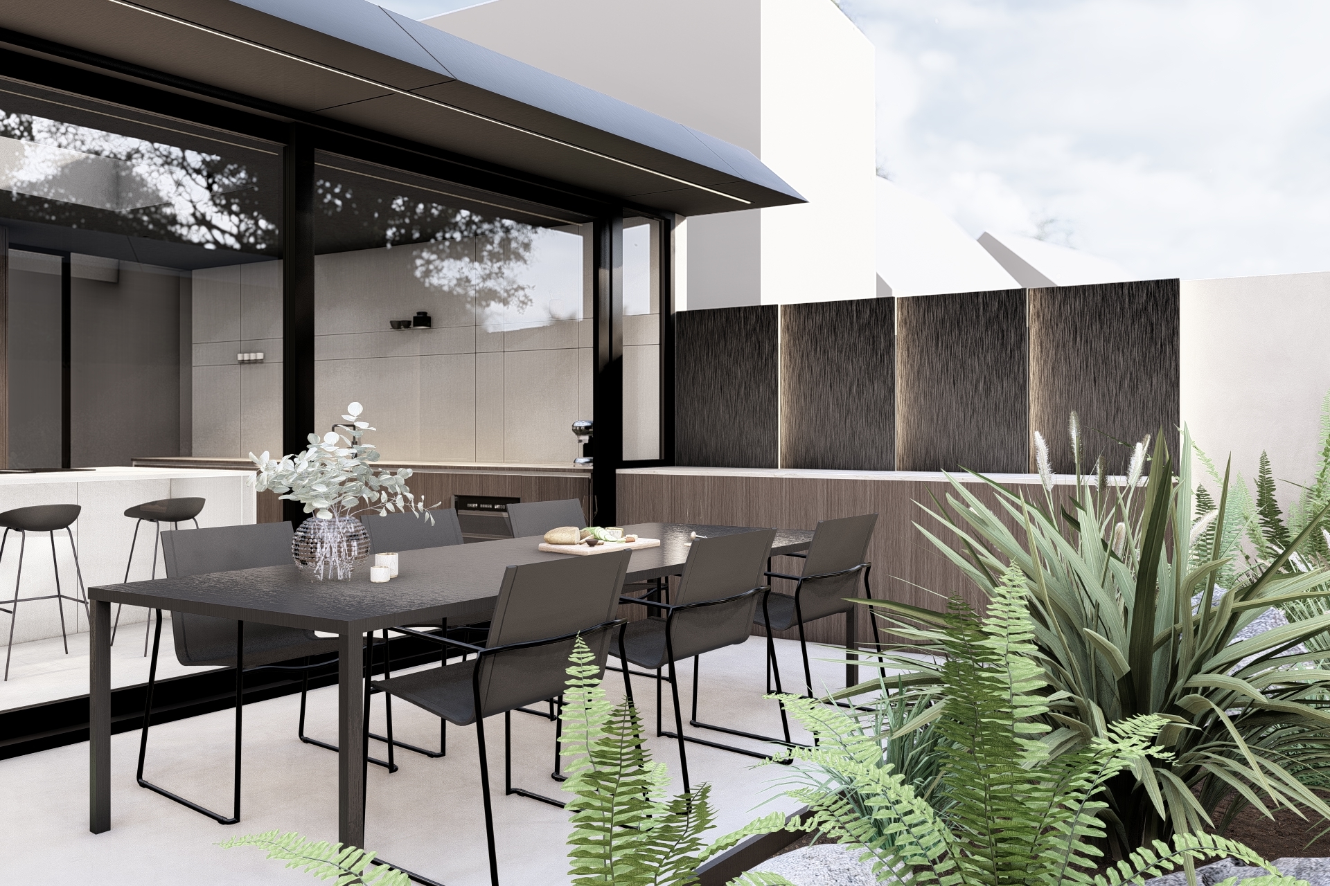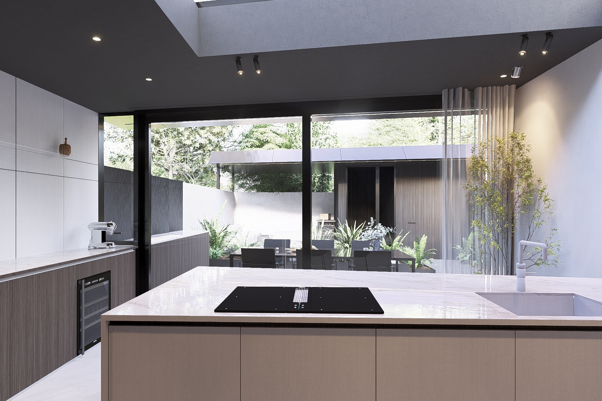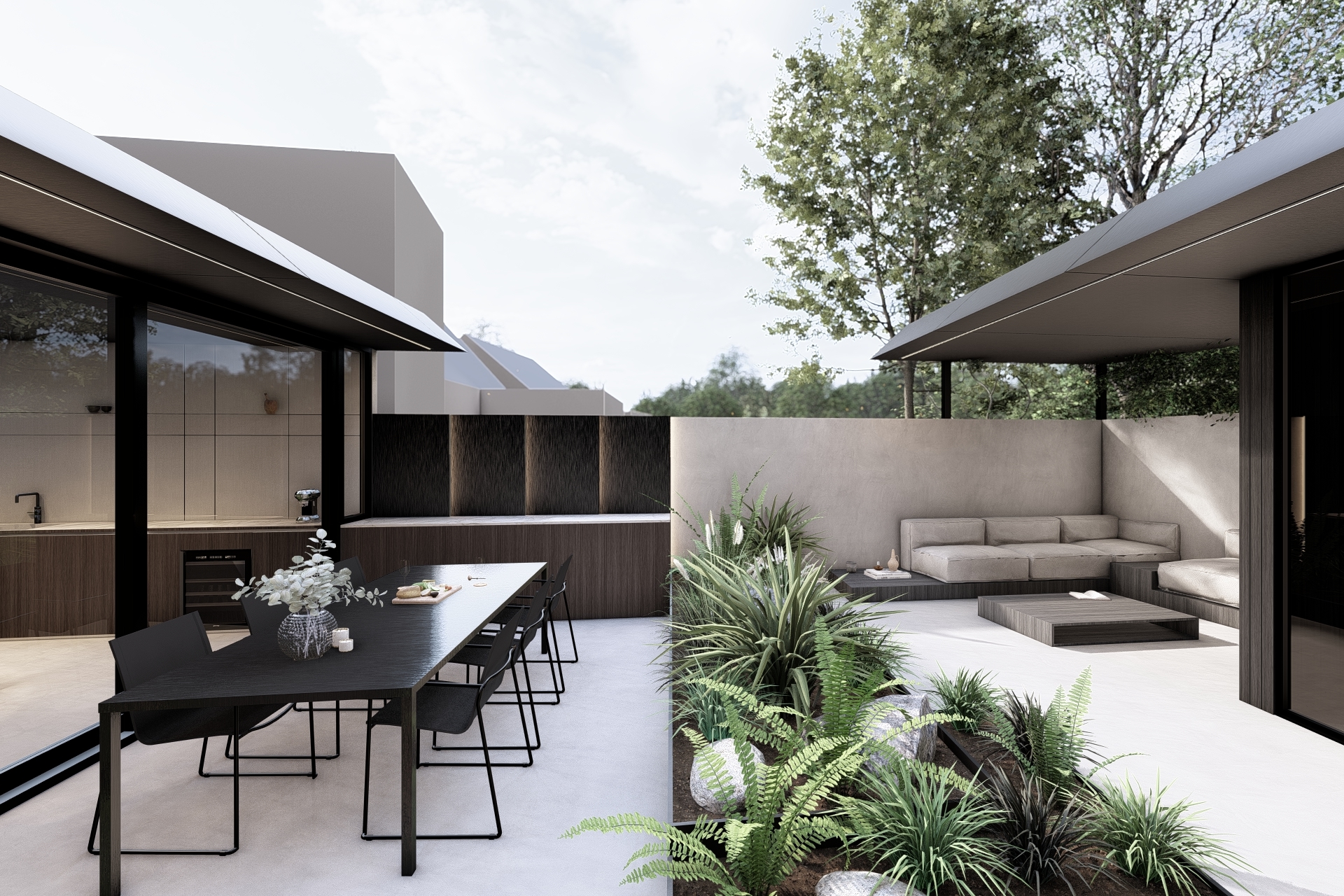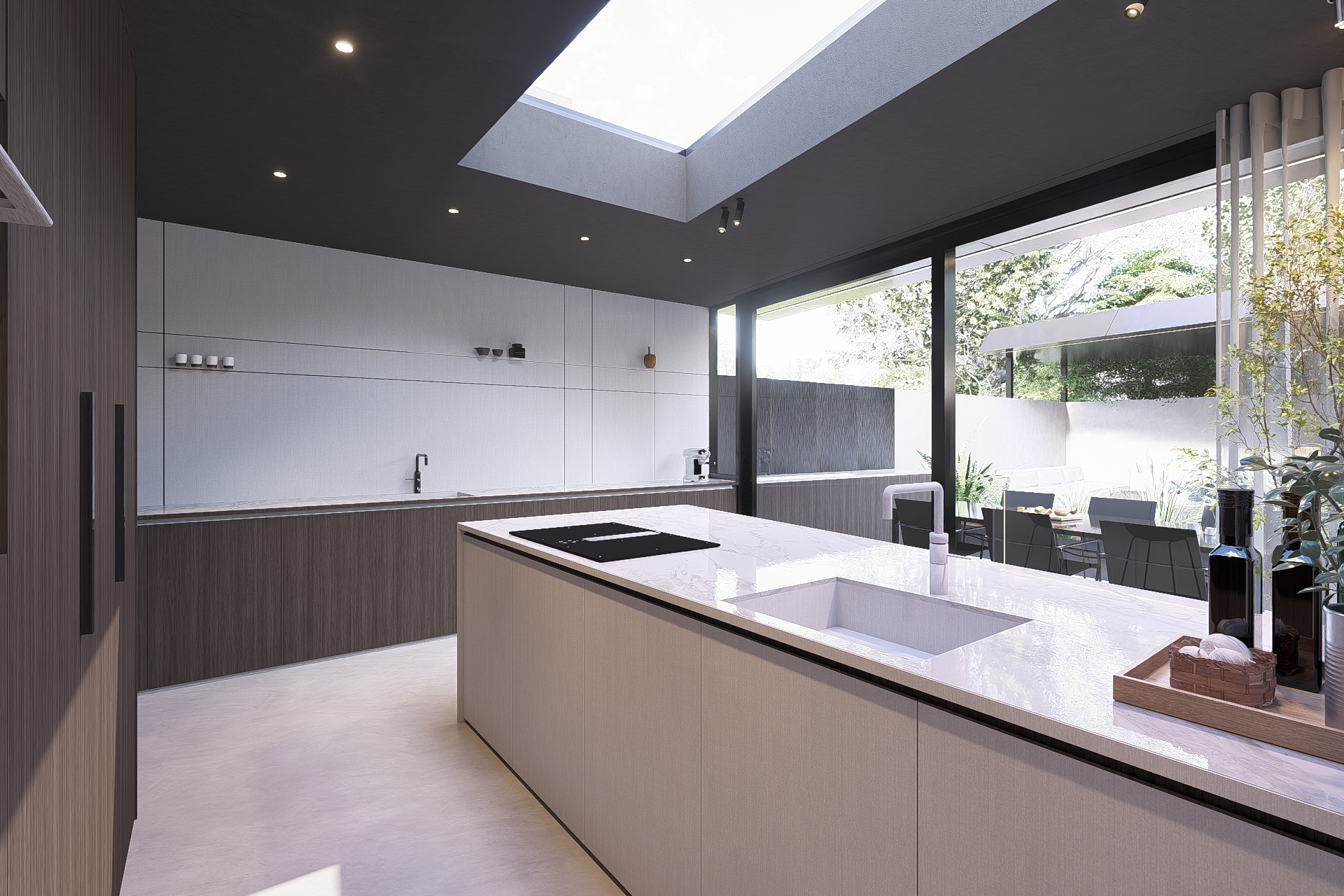 The boundary between inside and outside is reduced to a minimum. The kitchen continues visually and physically into an outdoor bar and a spacious terrace. The garden design is fully integrated into the concept, with a strategic planter marking the transition from the dining area to the sunken lounge.