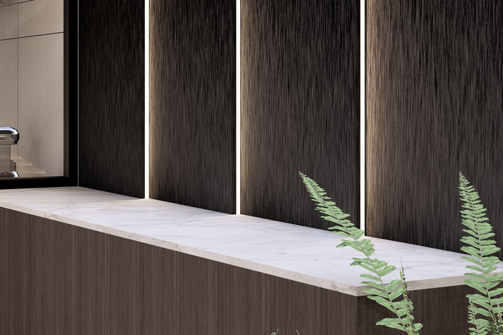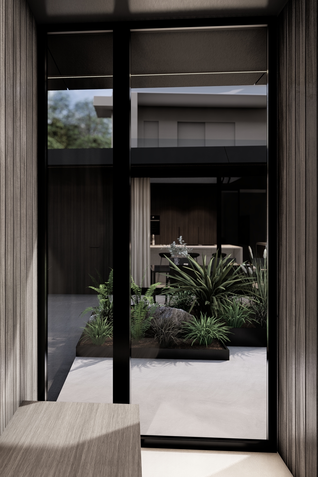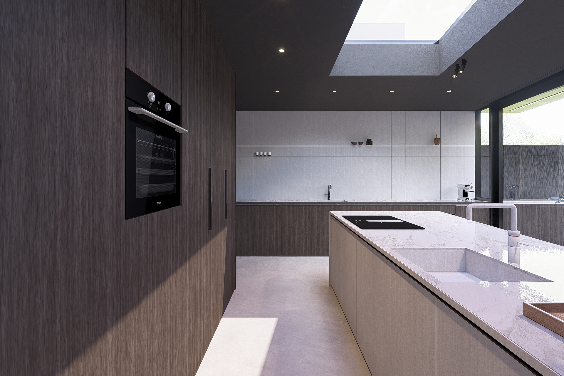 Here, the off-axis concept is carried through into the smallest details. The angled geometry guides movement through the space and connects interior and exterior in one continuous architectural line.