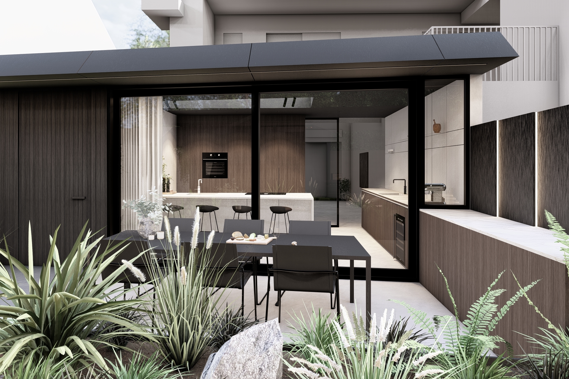 The material palette strengthens the contrast between the traditional villa and the new architectural intervention. Japanese charred timber, also known as Shou Sugi Ban, gives the façades a deep, textured appearance with an understated sense of luxury.