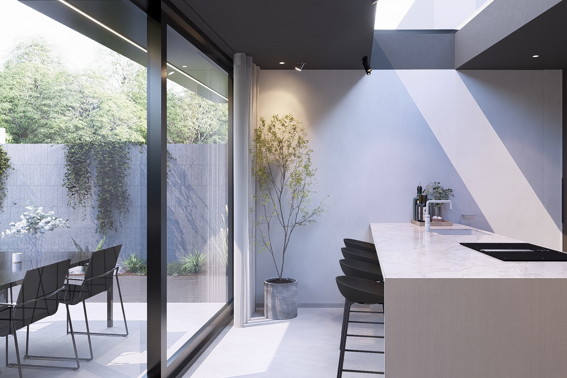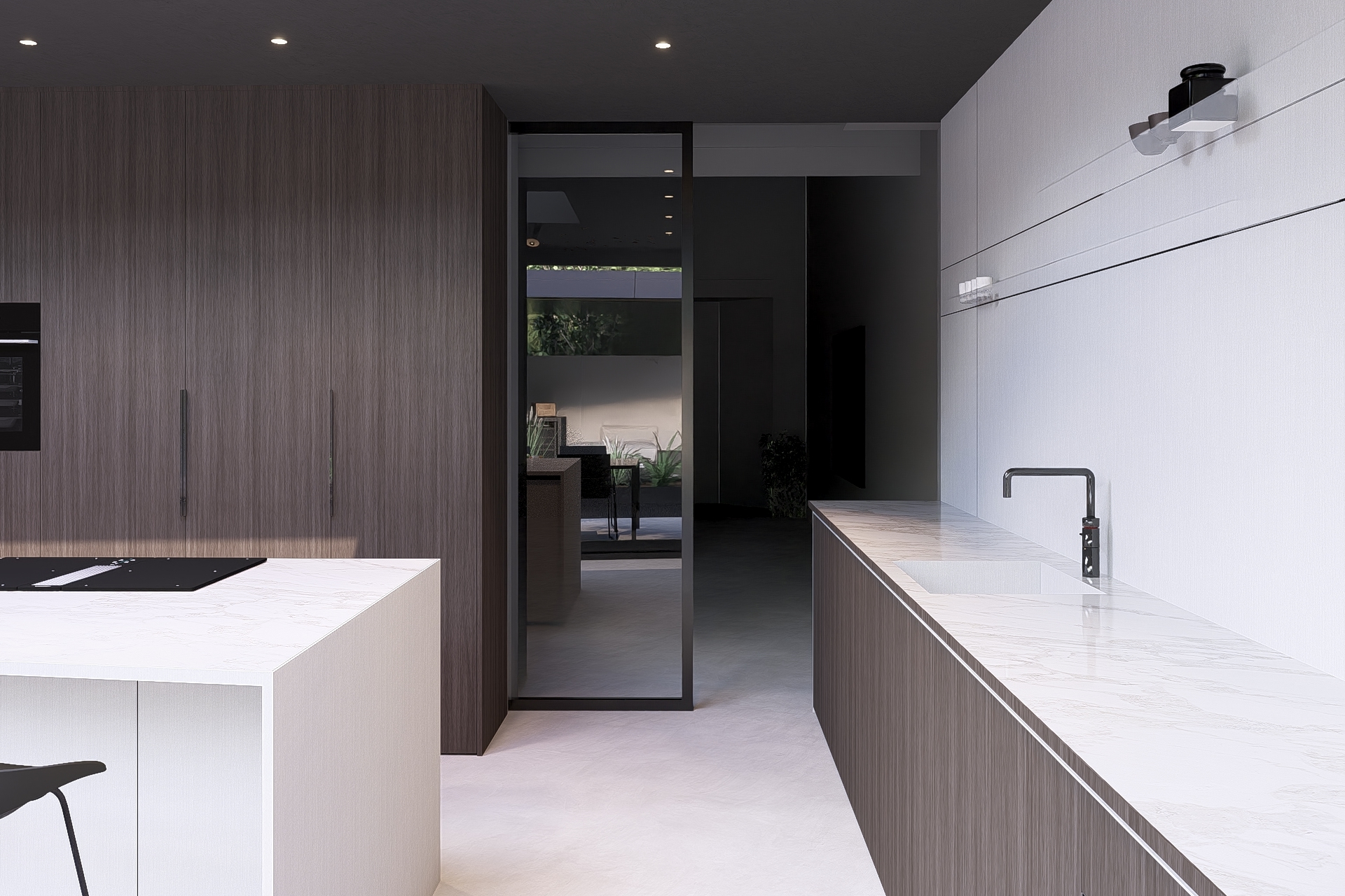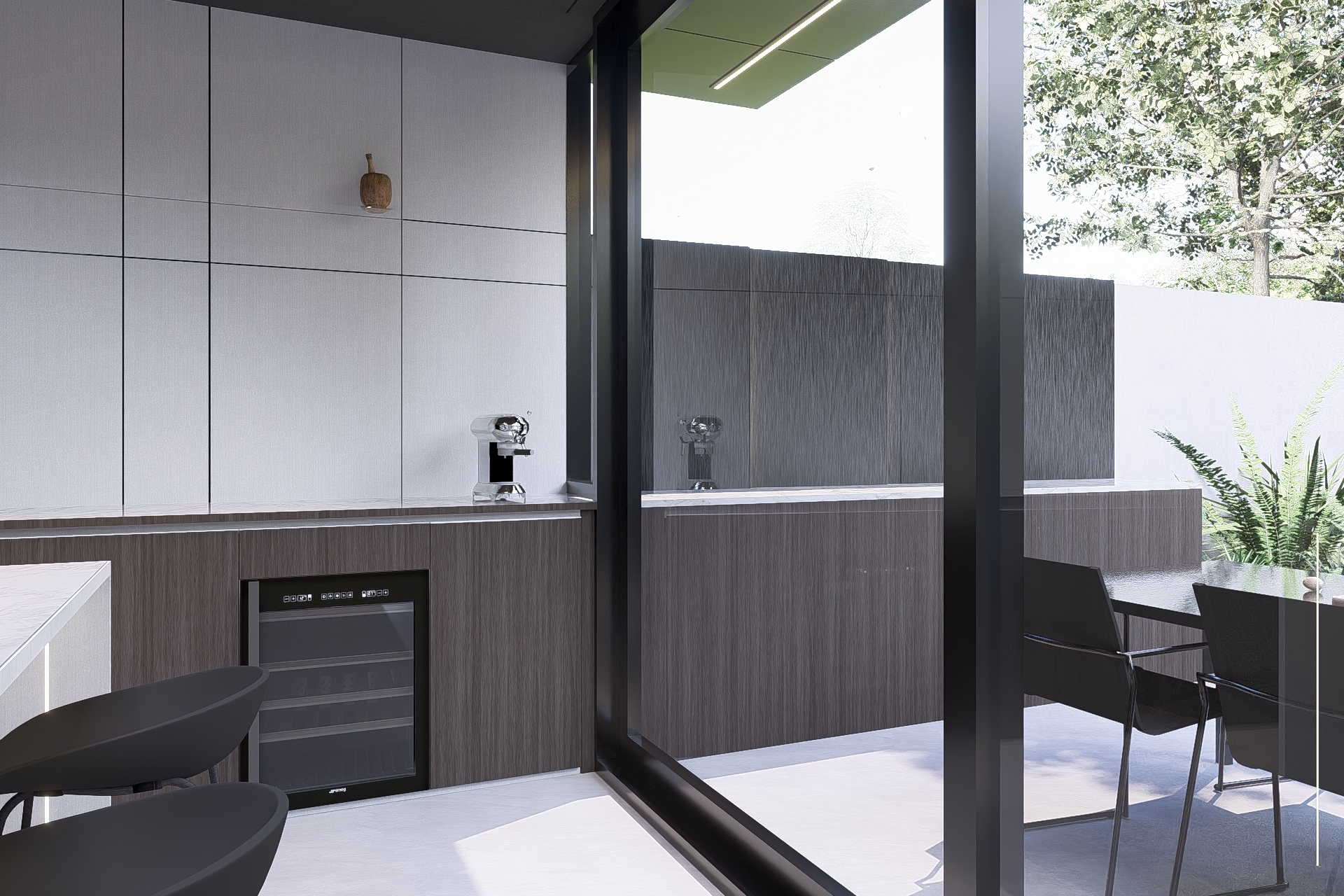 Black aluminium detailing defines the roof edge and sharpens the angular geometry of the extension. Inside, a microtopping concrete-look floor creates a seamless and calm foundation, while the same concrete-look finish continues into the garden walls. Natural stone façade tiles add texture and depth to the garden wall, and brushed aluminium panels with an integrated LED line create a refined boundary within the outdoor space. Together, these materials form a strong yet balanced dialogue between tactility, precision and atmosphere.