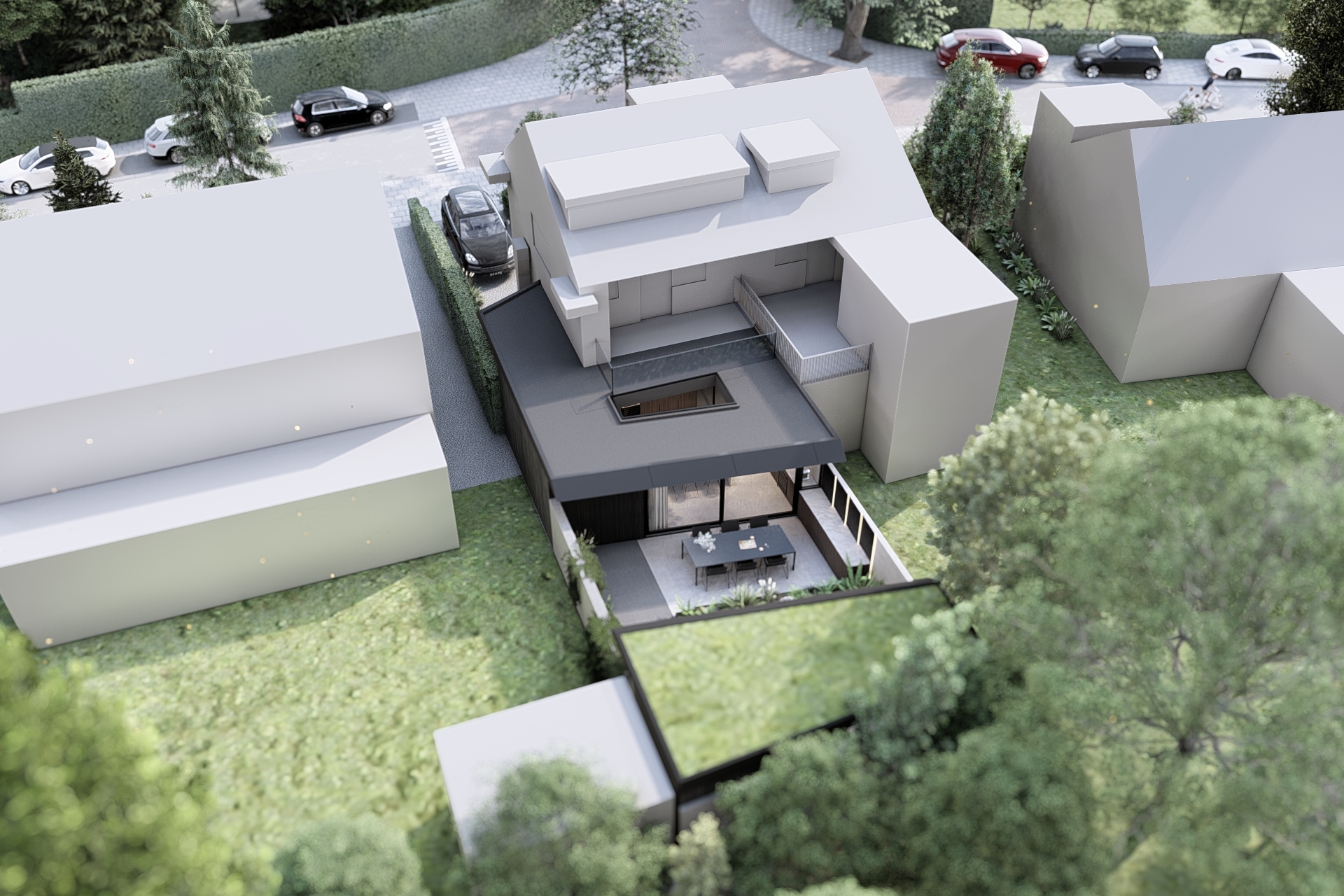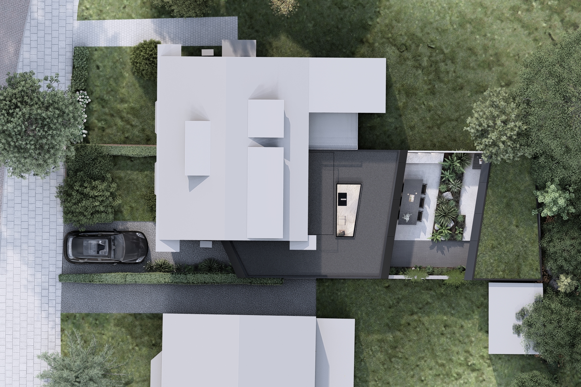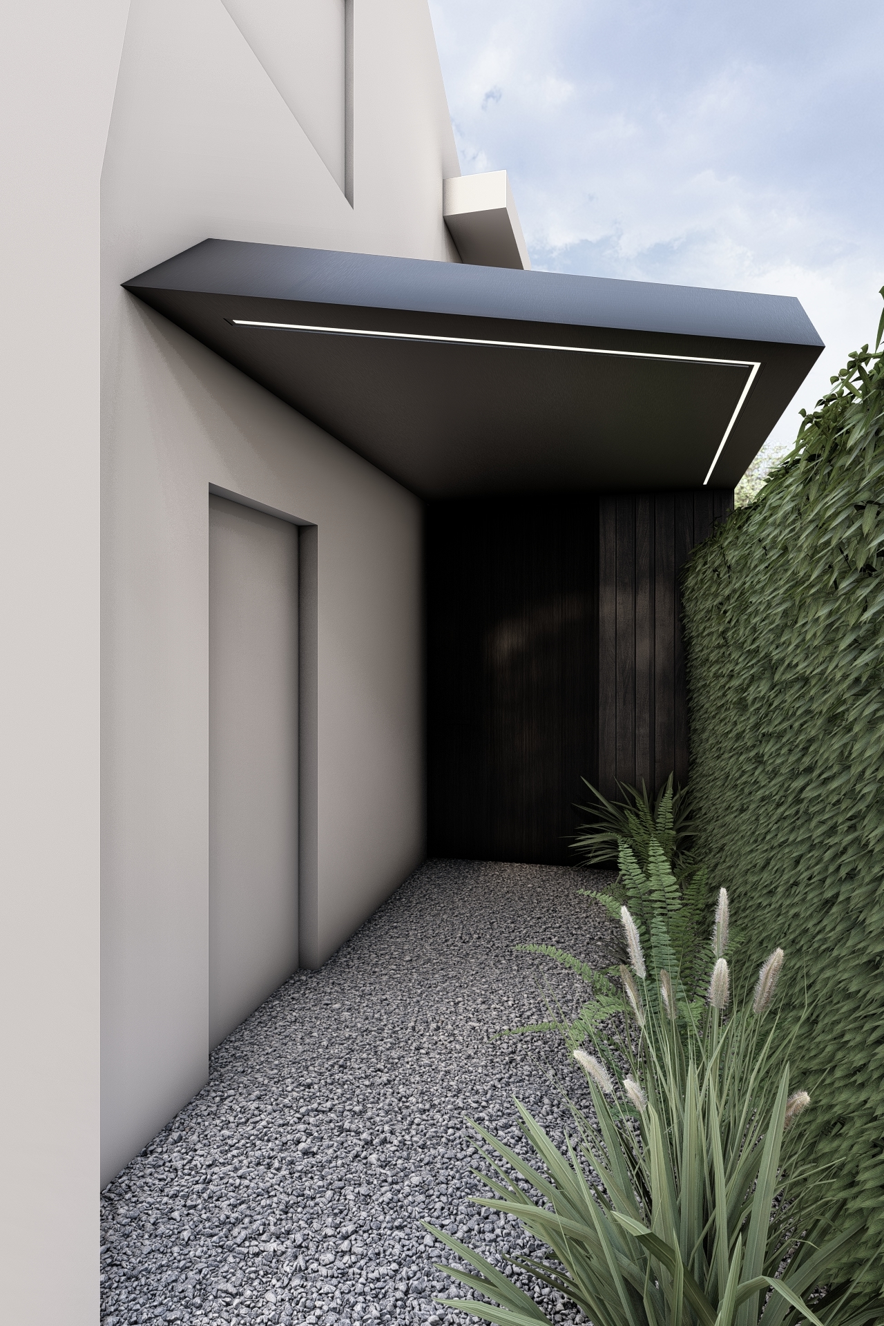 The design is immediately defined by its radical linework. The roof edge extends into a sharp point, finished in deep black aluminium detailing, as if the volume has been cut with surgical precision.