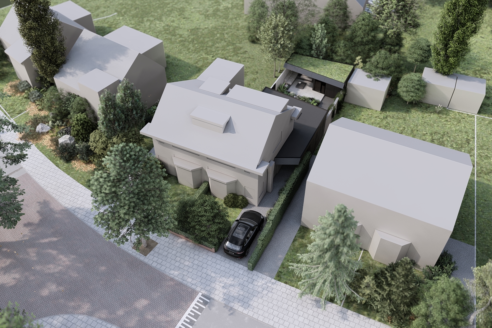 The extension subtly appears around the corner of the existing home, where the angled shape creates a clear architectural tension between old and new. Compact in size, but strong in expression, the volume gives the villa a contemporary and unexpected addition.