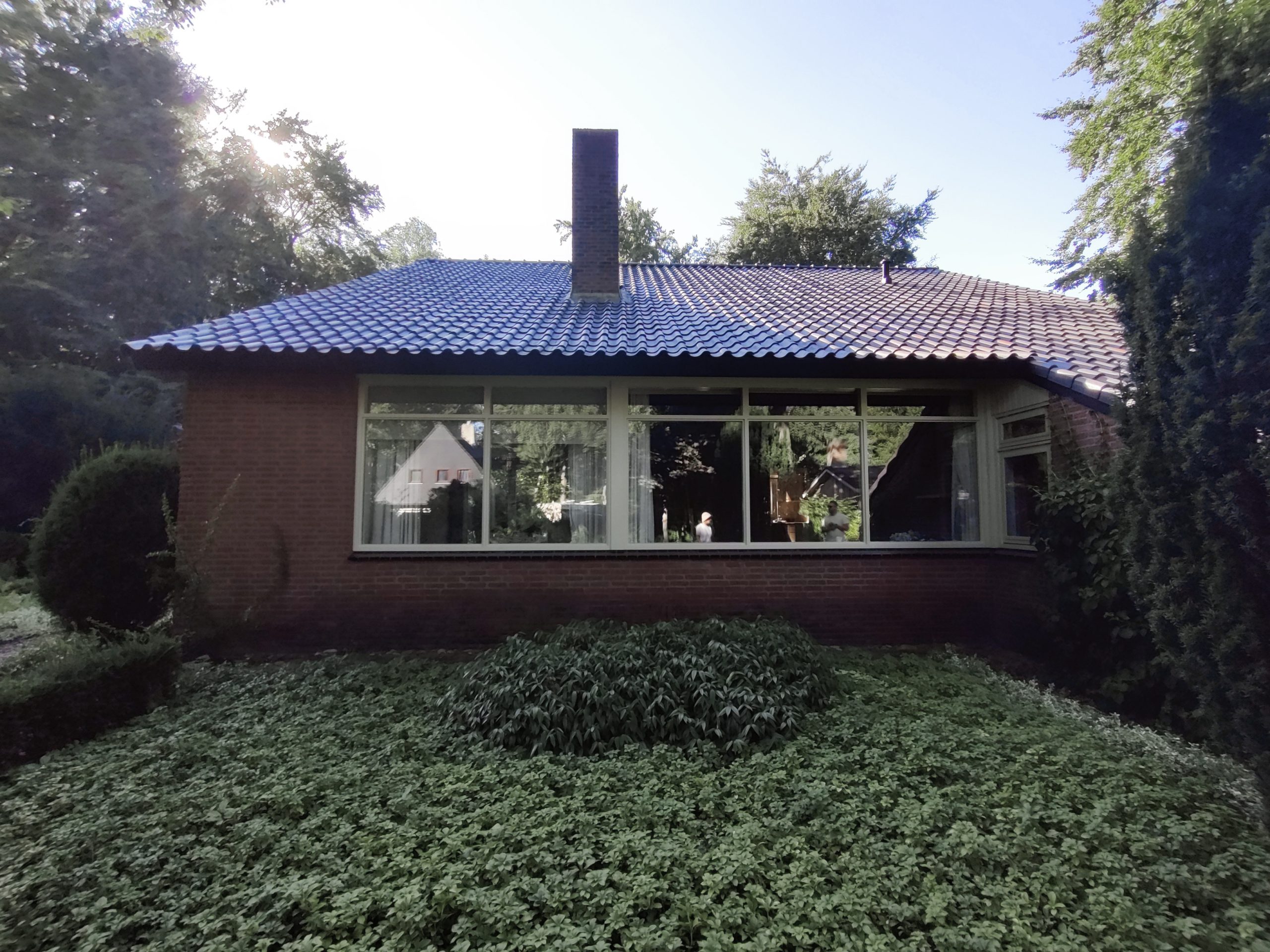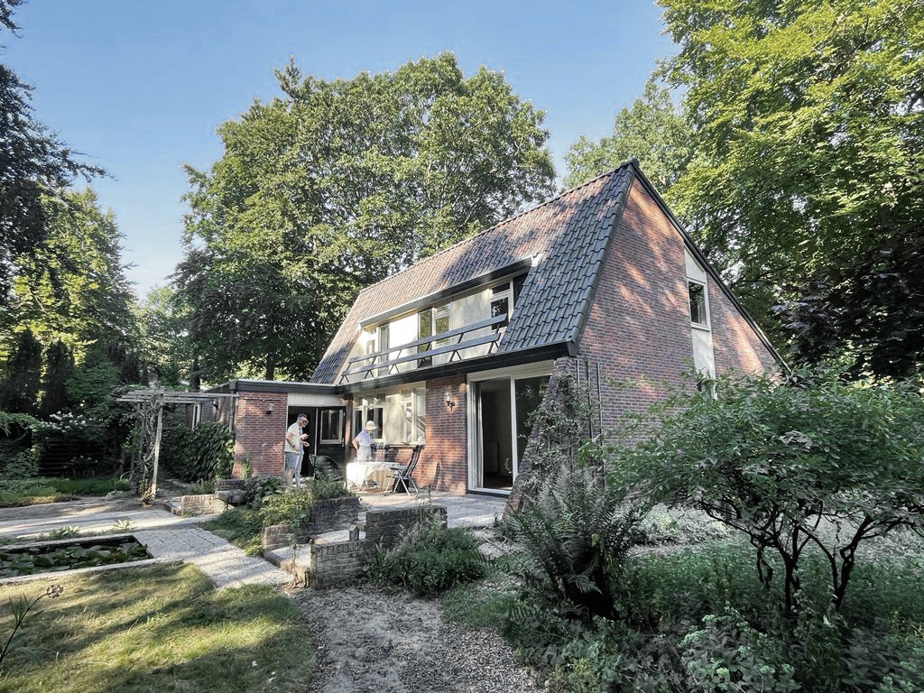 The original pitched-roof main volume is replaced by a monolithic extension, with careful attention to facade openings toward the woods and occupant privacy.