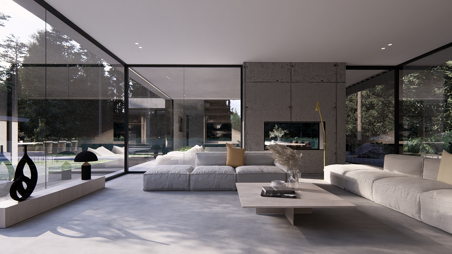 The raw materials in the nature create a strong connection between environments. The raw concrete comes from the outside and connects to the inside creating a fireplace in the middle.