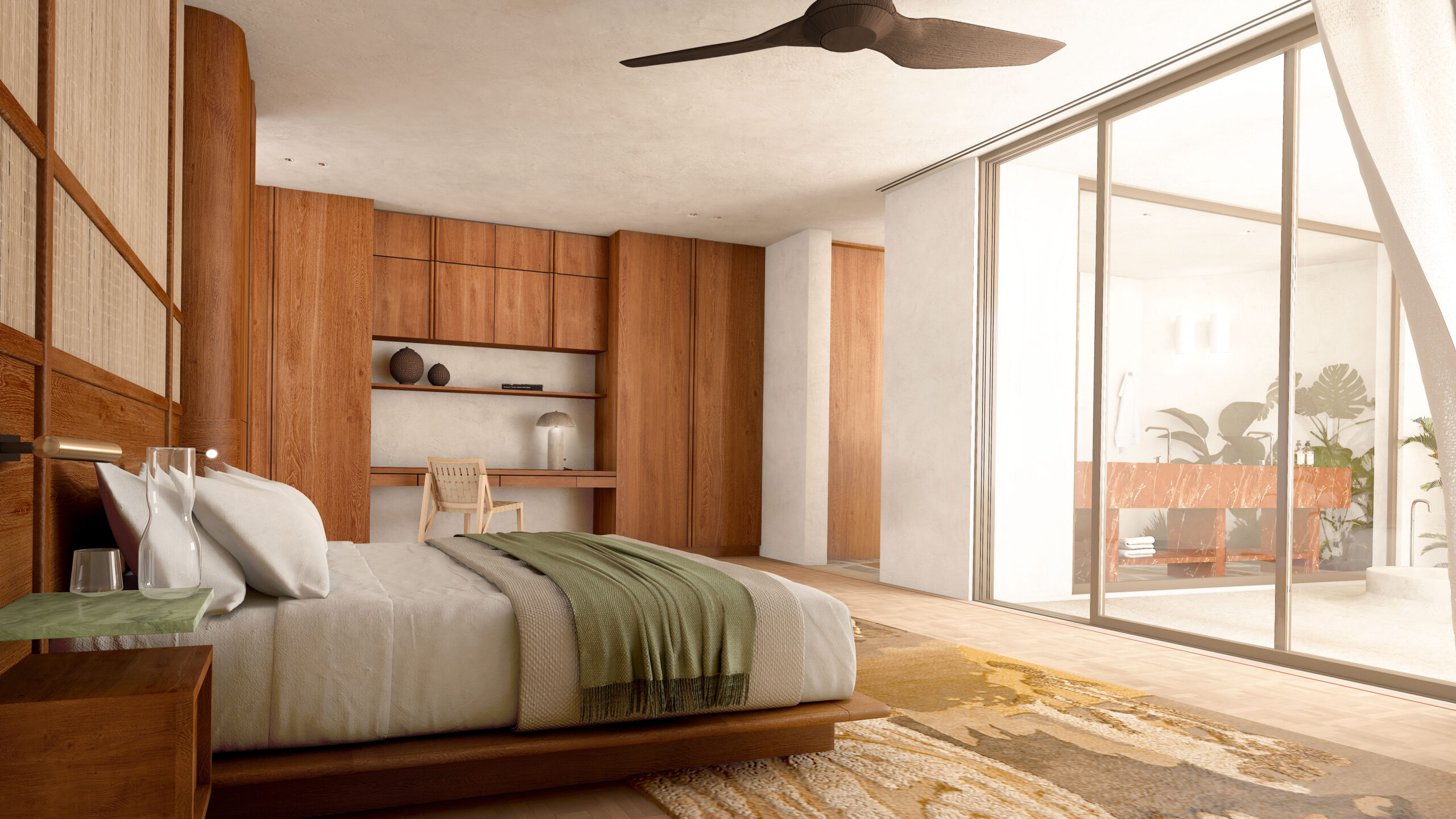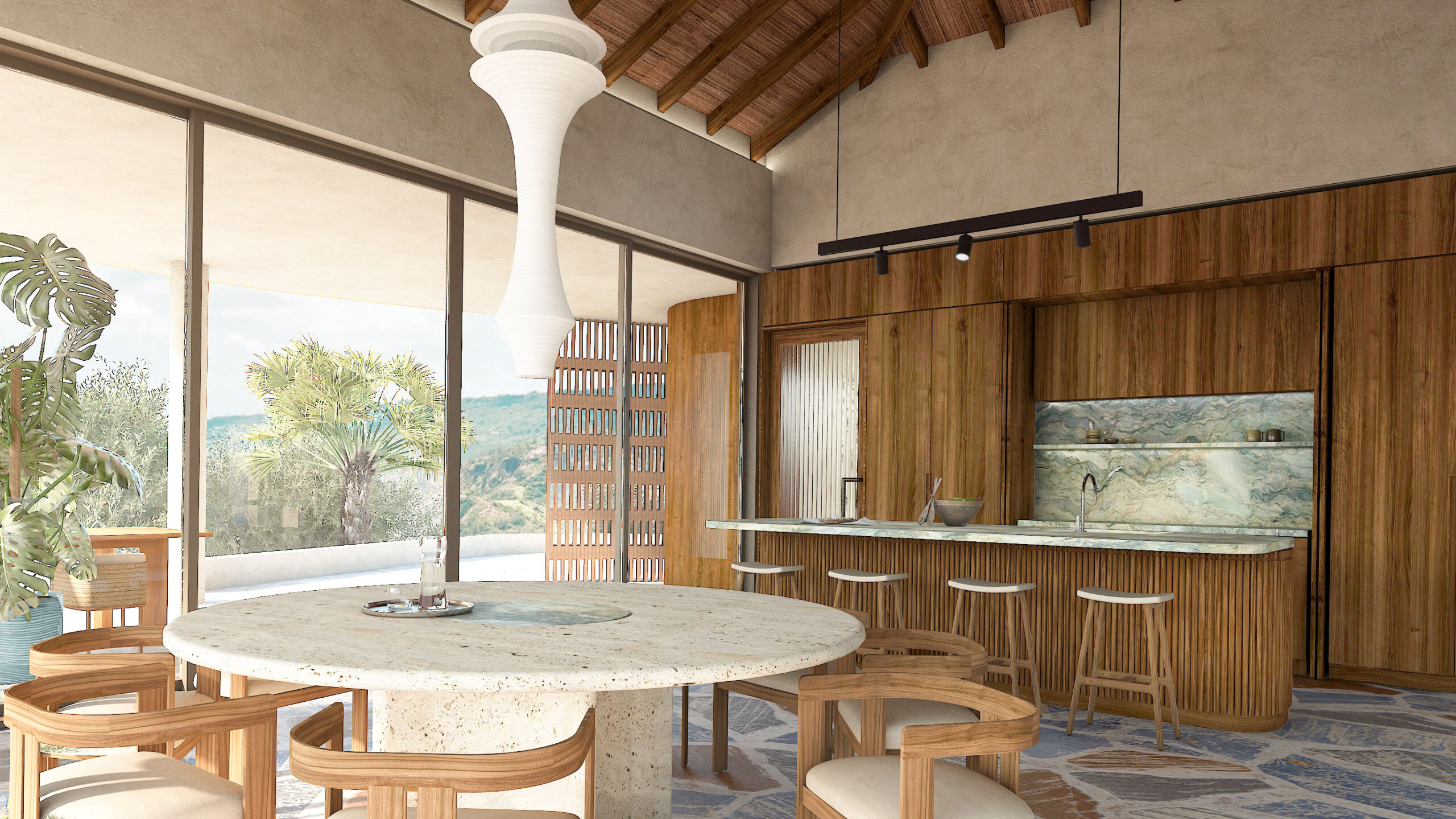 Contrasting textures and materials come together to shape the exclusive concept of Villa Boca 33. Natural elements like limewashed greige render, smoked oak, local black diabas, and cobblestone are seamlessly blended, creating a refined yet organic aesthetic that perfectly suits the Caribbean setting.