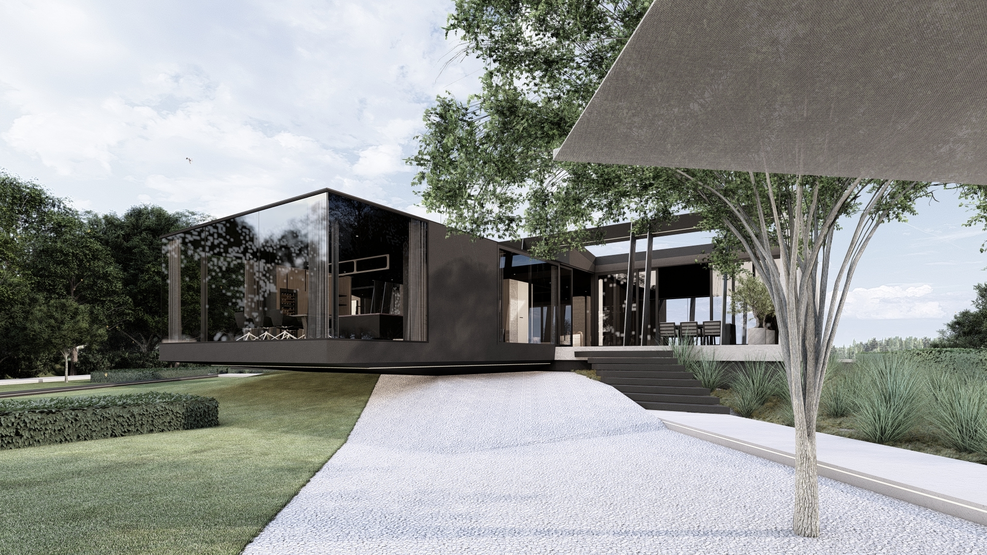 The garden desing is created by taking into account the lines of the house and let them create the functions and paths.