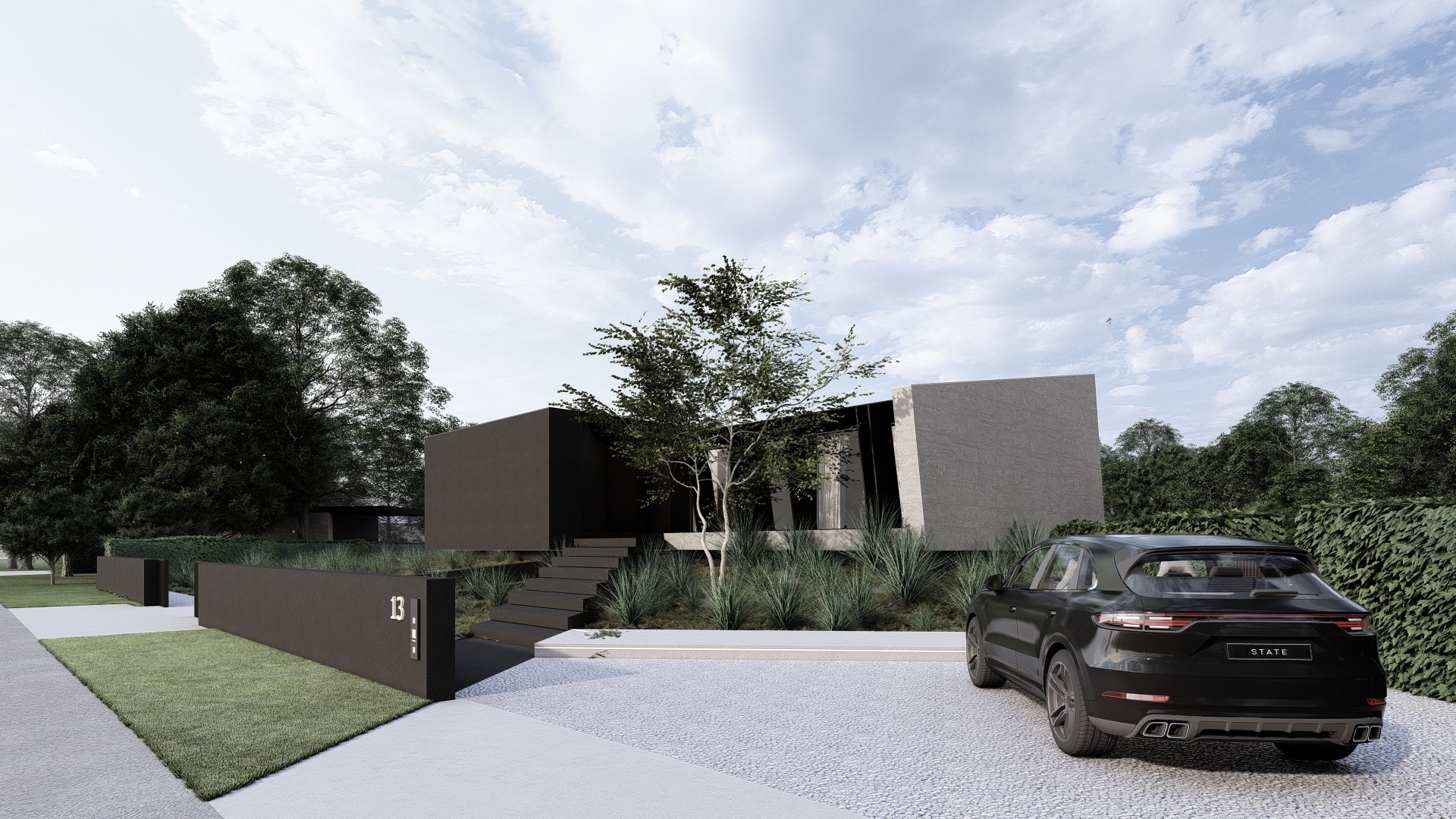 Villa X is strongly characterized by its dark and closed tones, especially in the strong volume that floats over the garage entrance, however, a natural stone with tranquile tones appears as a slab and continues to both side walls of the villa and is again seen in the void crossing the two floors.