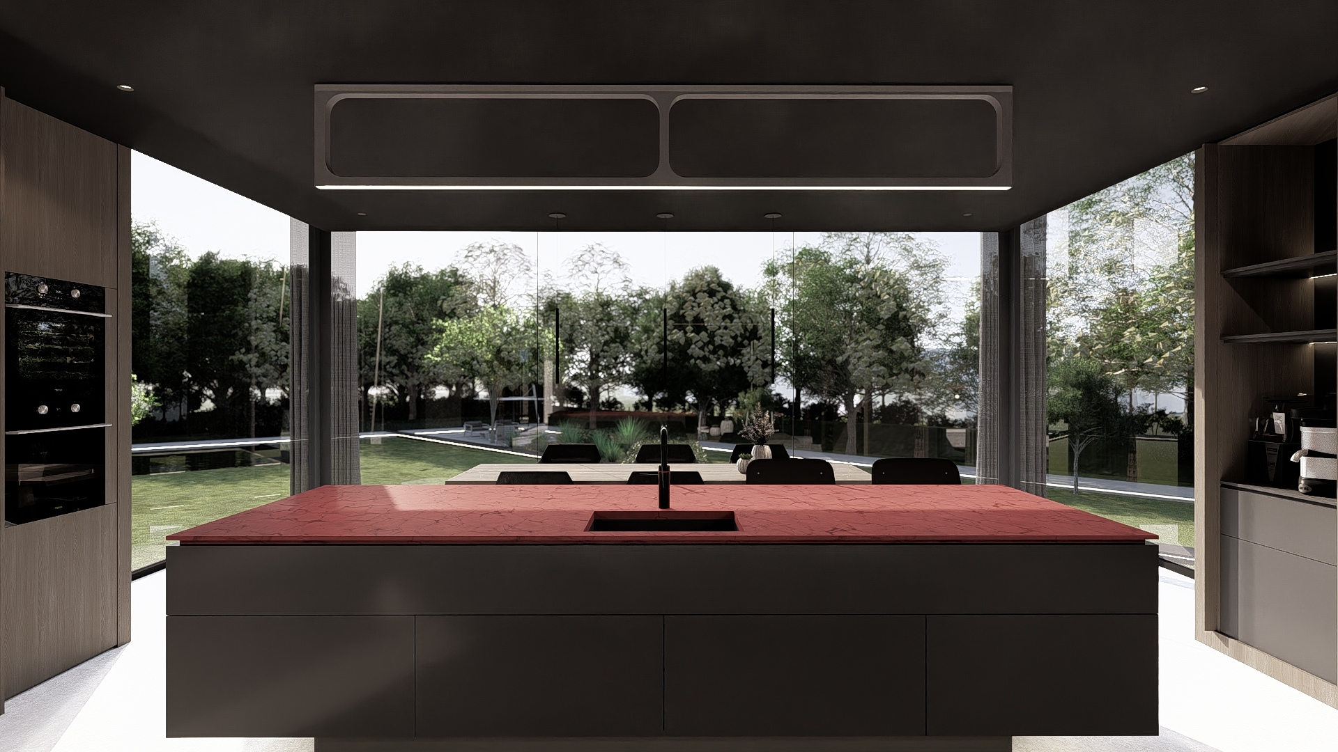 This floating volume is located in the back wing of the house and it hosts two important social funtions, the kitchen and the dinning area. At the end of this volume we are completely surrounded by glass which, added to the sensation of being elevated, connects us strongly with the nature that surrounds the house.