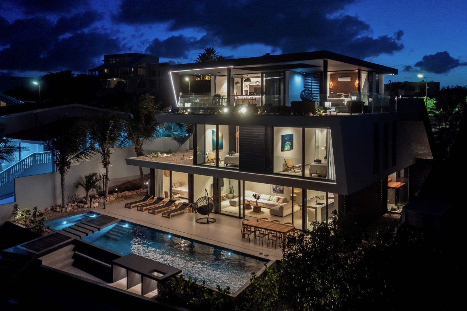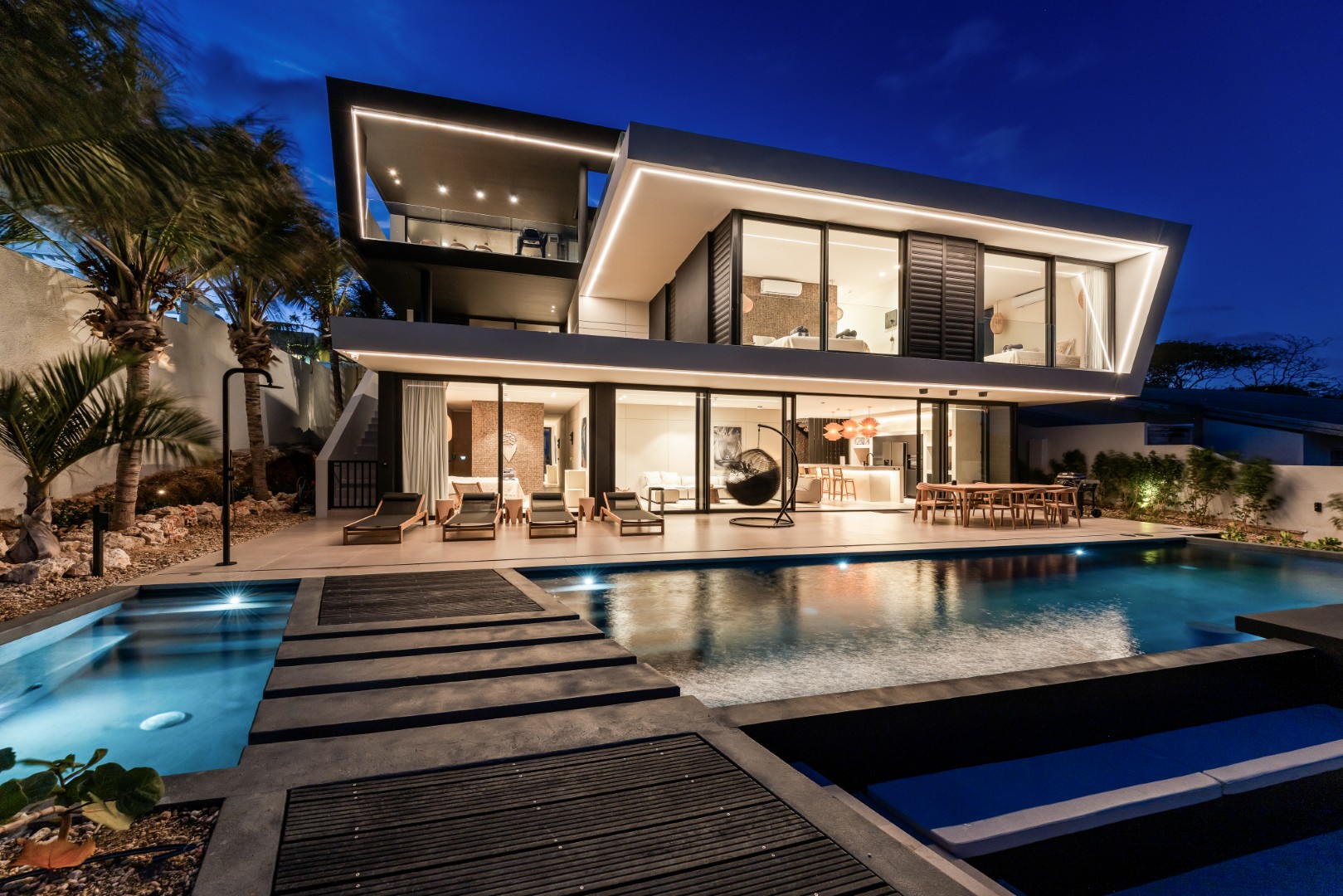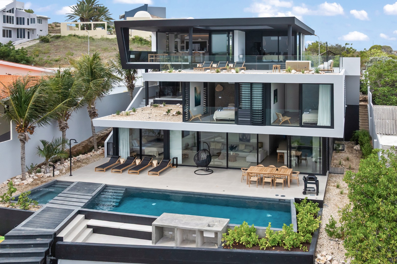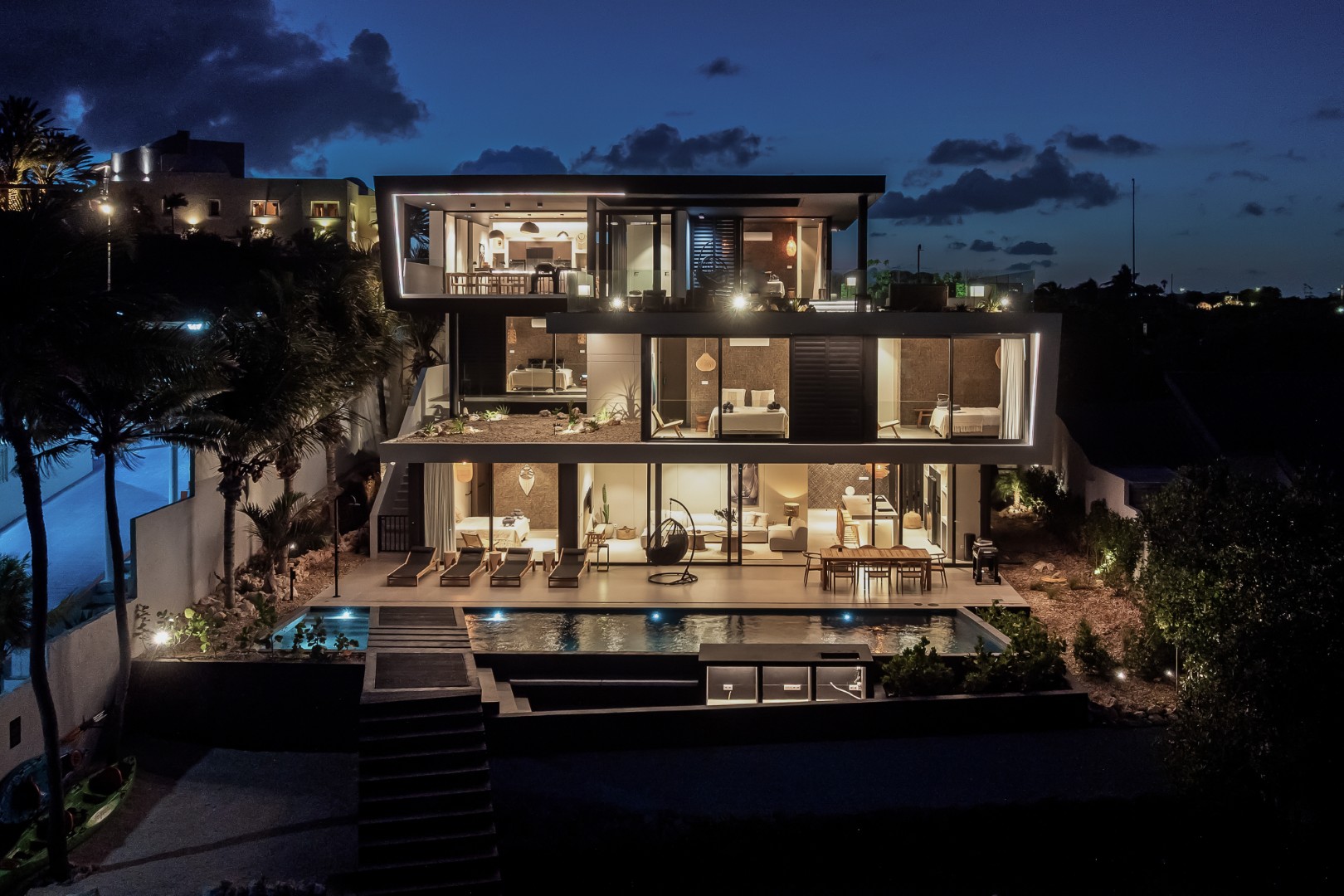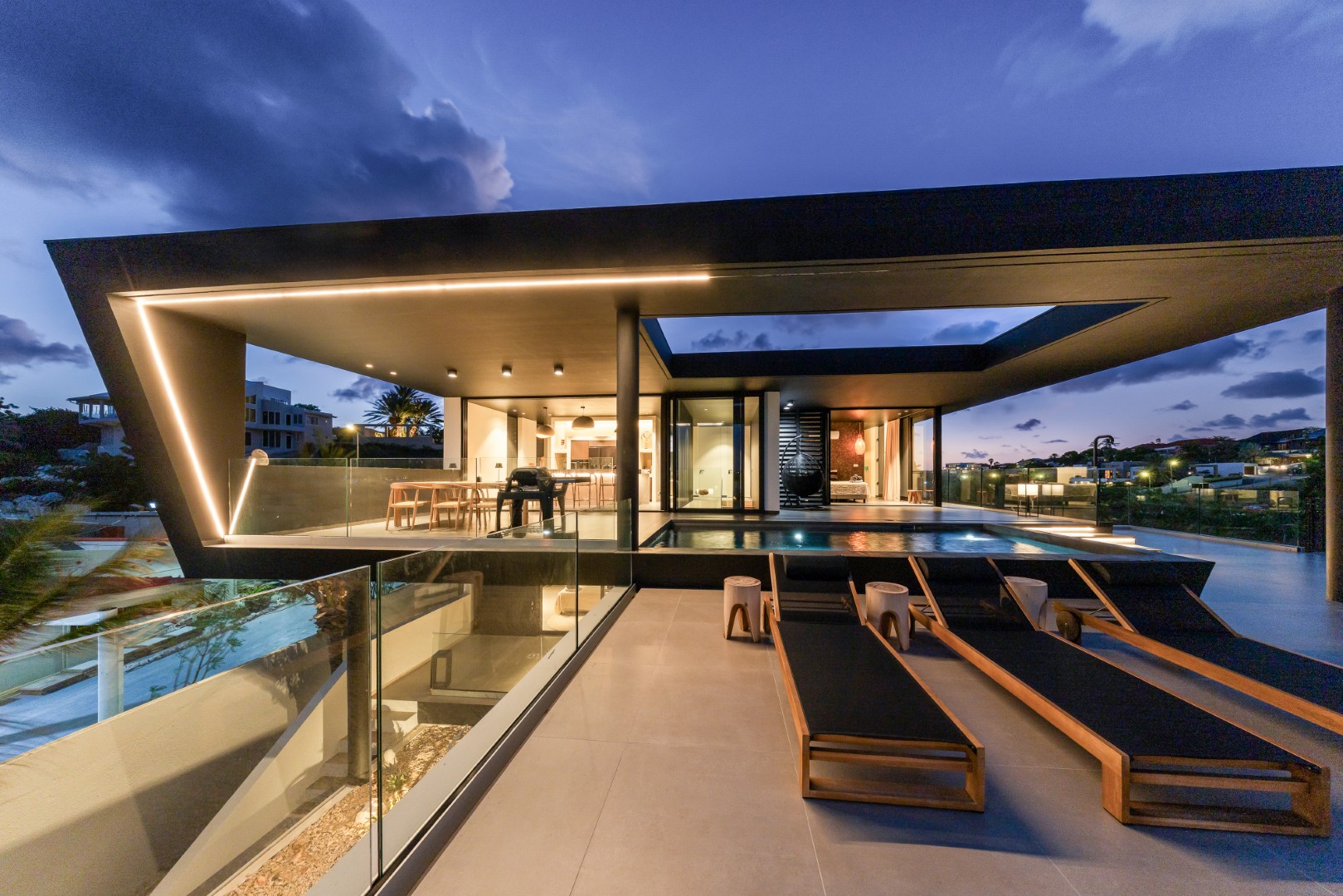 The use of black and white stucco combined with concrete tiles creates a bold yet refined material palette that defines the architectural character of the villa. These contrasting finishes work in harmony with the natural surroundings, offering depth and balance to the overall composition.