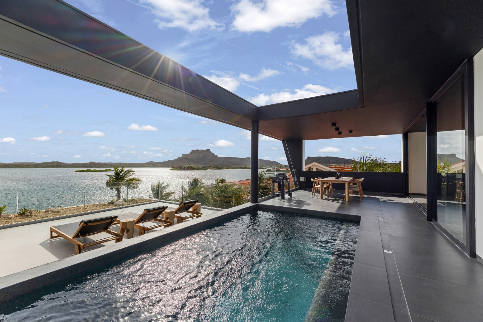 In the design, the black and concrete form a strong contrast. The pool forms in the opposite corners of the facade, this image is reinforced by the sitting pit, which in turn seems to float on itself in mirror image over the sea. The sitting pit is the connecting element in which a two-sided bar, Jacuzzi and lounge are situated.