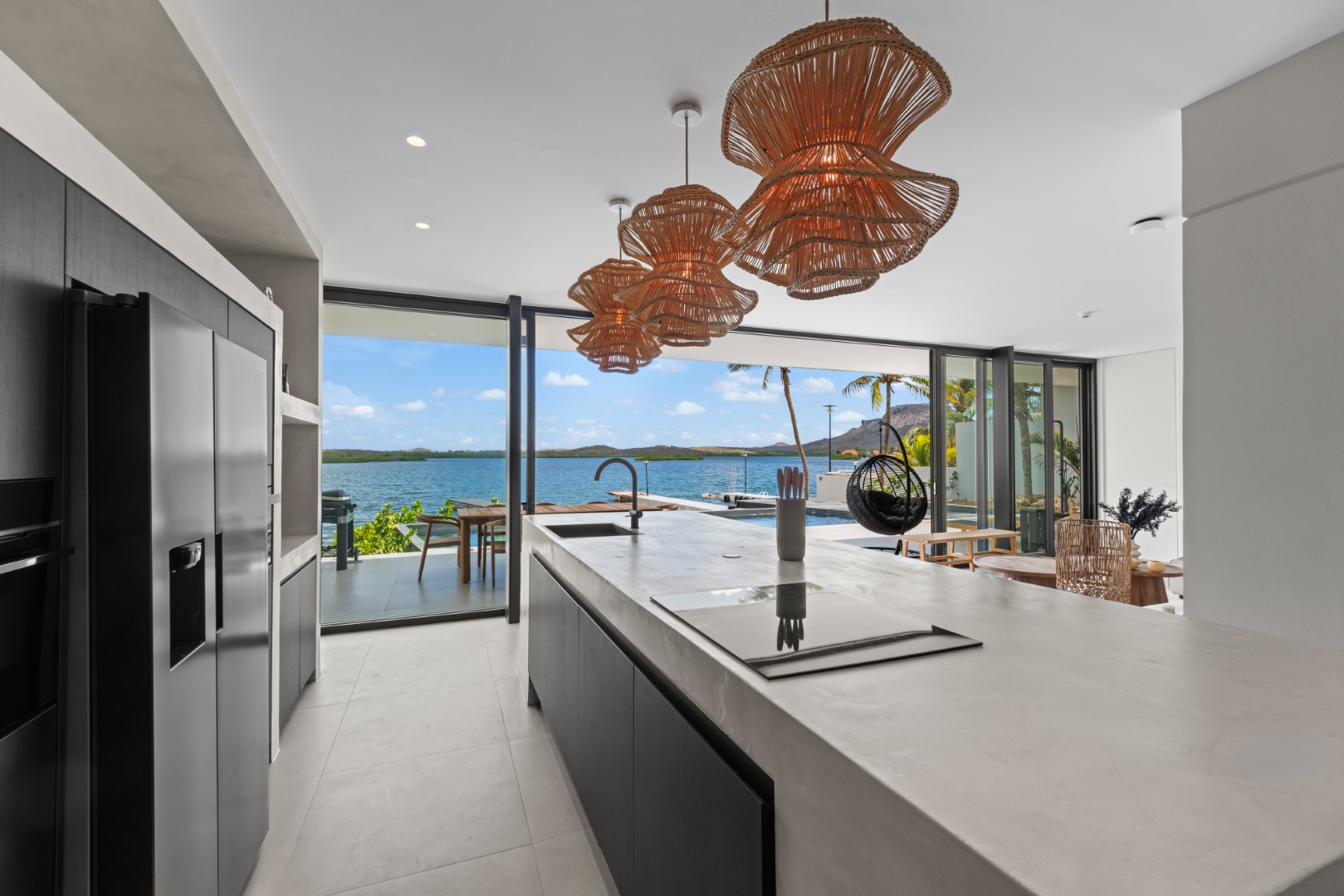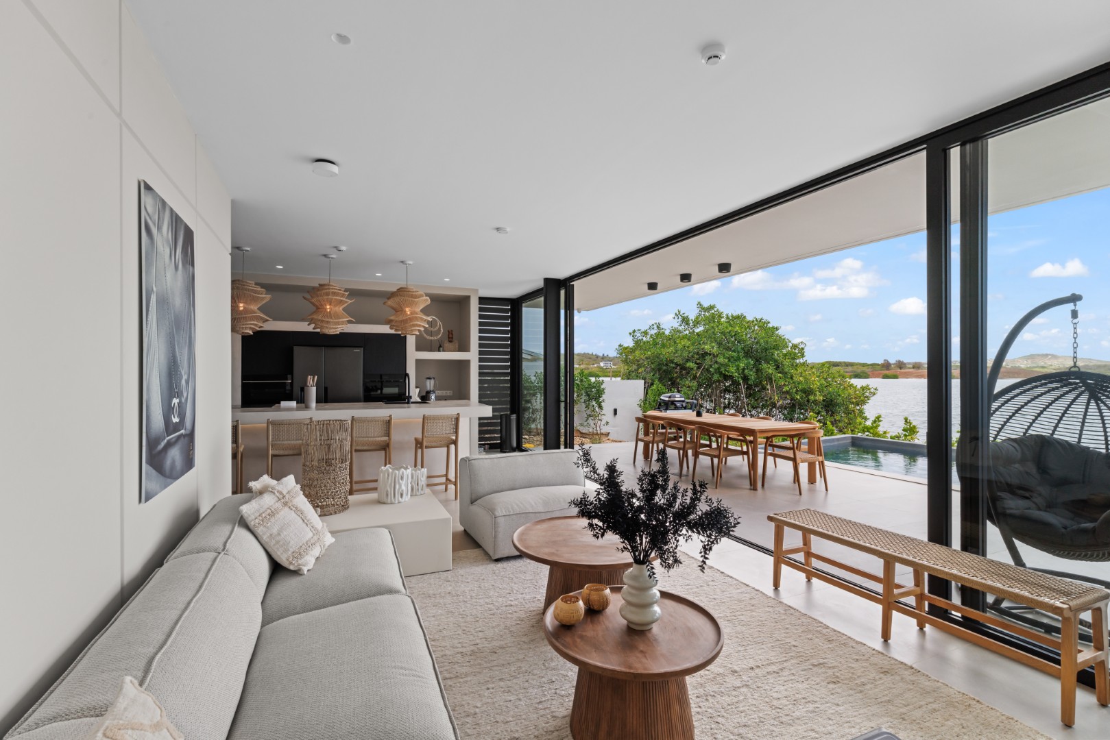 Large black-framed doors accentuate the openness of the design, drawing the outside in and reinforcing the strong visual connection with the landscape.